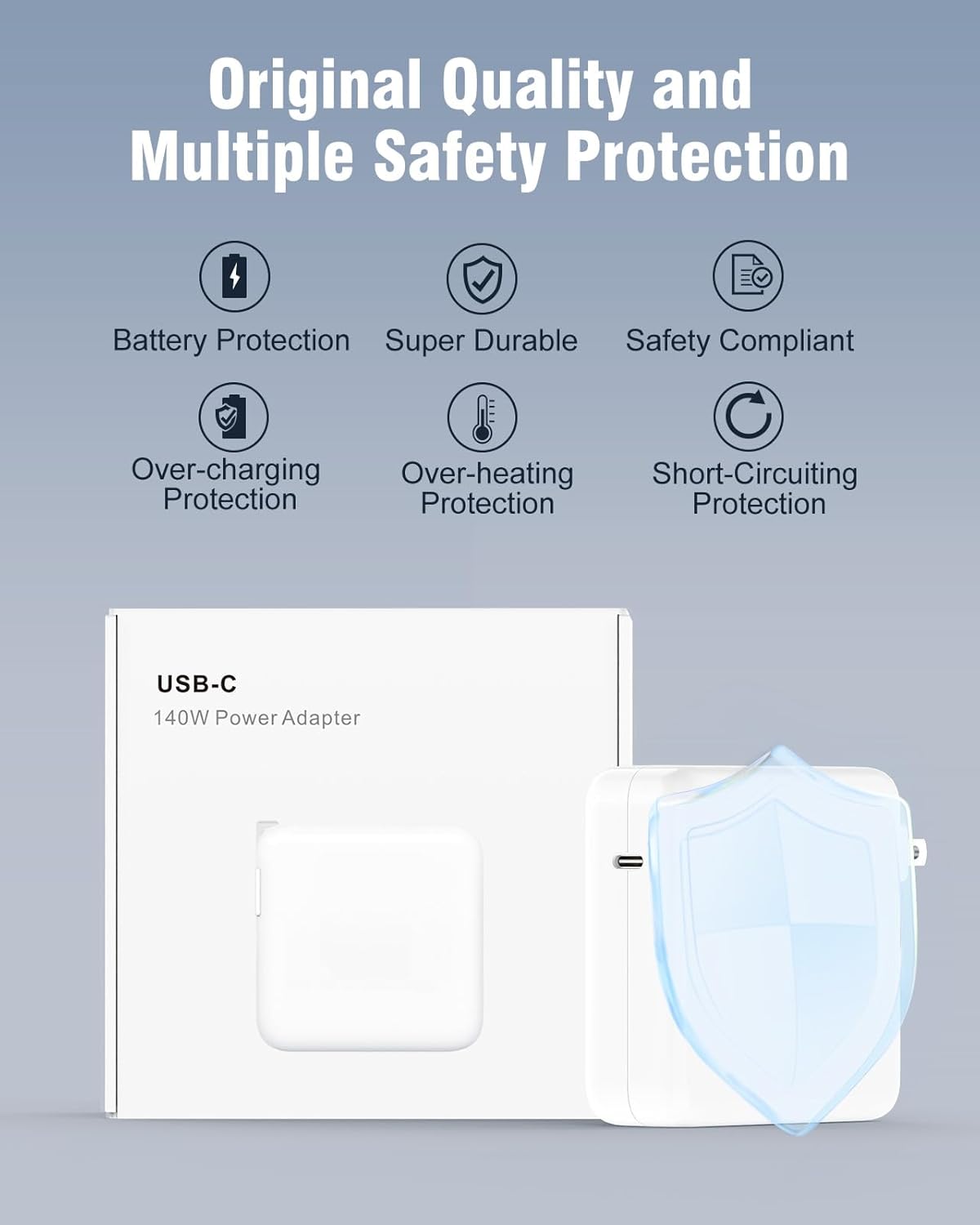 PD 3.1 Super Fast Charging: fast charge your MacBook Pro or MacBook Air up to 50% in only 30mins which is Official Standard Charging Speed, thanks to 140W / 28W / 5A max output let it can cover 96W/70W/35W/30W and provide you greater charging stability and higher efficiency to meet the high-speed processing capacity of M4, M3, M2, M1 Pro Max chip.