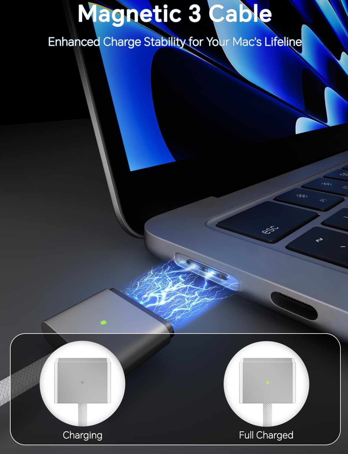 2M / 6.6FT Strong Magnetic Charging Cable: This Gen3 magnetic cable is designed to provide a secure and stable connection for( use with) MacBook devices, minimizing accidental disconnects and enhancing device protection. With a convenient 2-meter length, it offers extended reach for flexible charging. The built-in LED indicator displays yellow while charging and turns green when fully charged, providing instant feedback on your device’s power status.