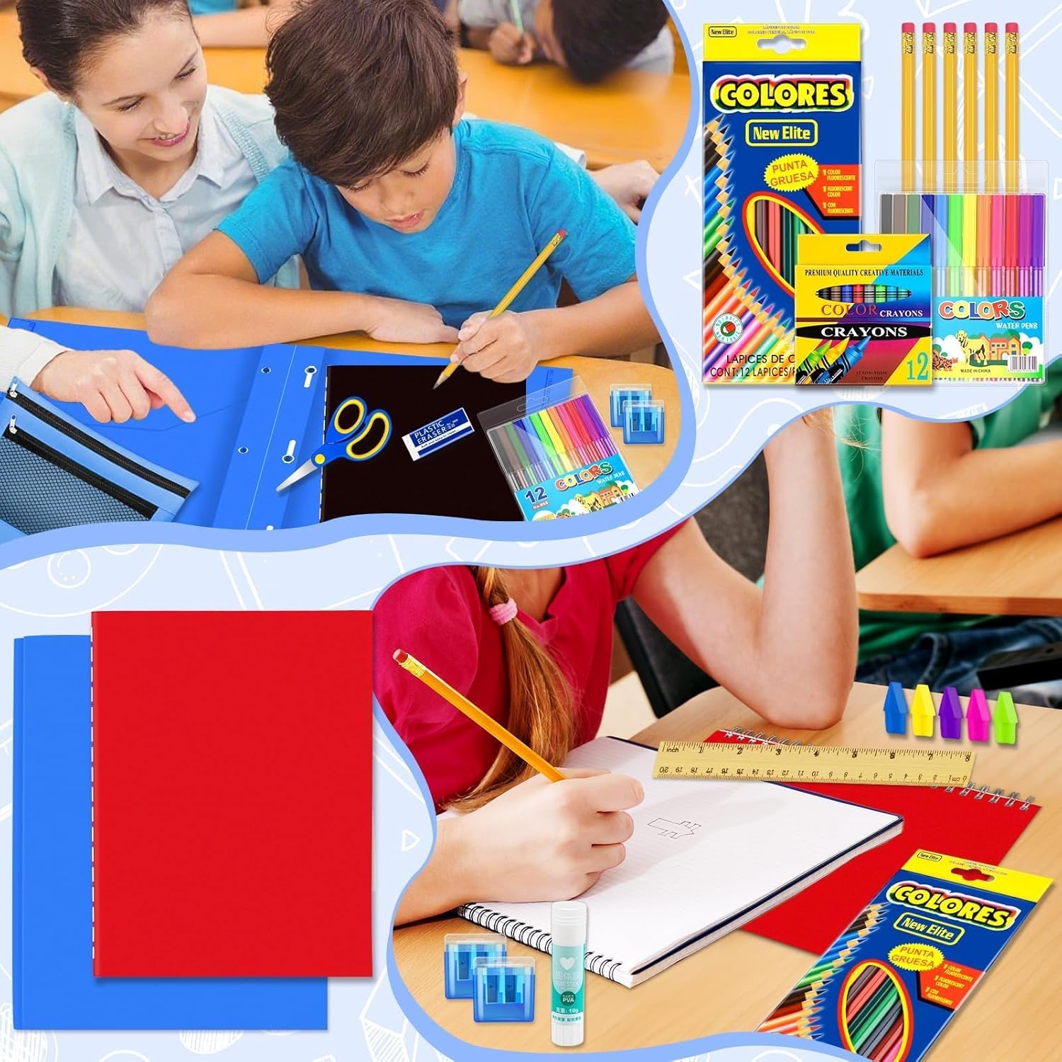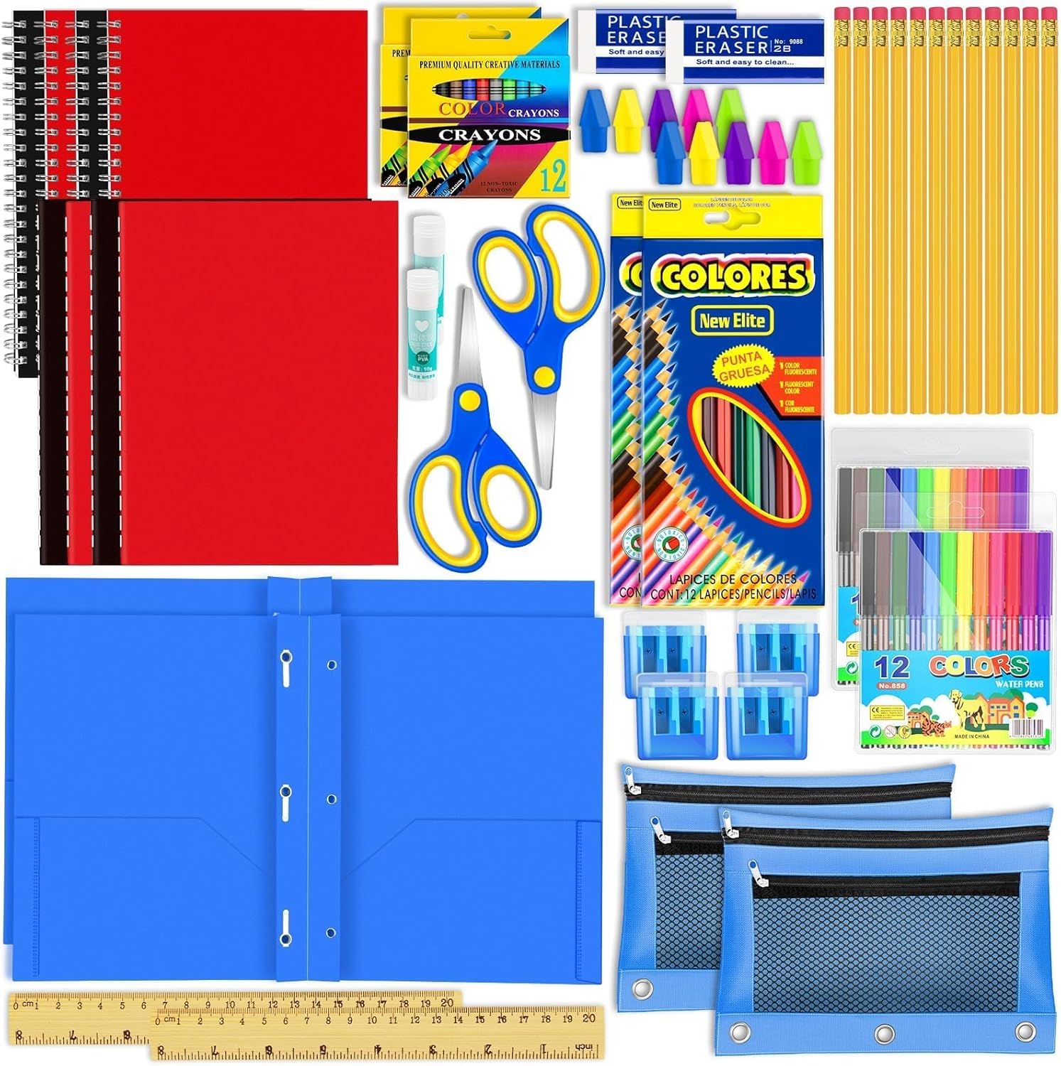Package Included: You will get 2 sets of school supply kits; each set includes 2 spiral notebooks, 2 coil notebooks, 6 HB pencils, 12 crayons, 12 colored pencils, 12 watercolor pens, 1 pair of scissors, 2 pencil sharpeners, 1 glue stick, 1 ruler, 1 eraser, 5 special-shaped erasers, 1 pencil case, 1 folder, 1 ruler