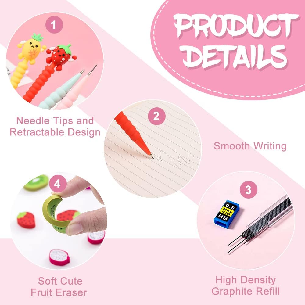 【Funny Fruit Design】: The top of mechanical pencils are designed with a cute cartoon fruit shape, eraser is also design with cartoon fruit image. These cute elements can easily motivate students to learn, while the fruit erasers make it easy for students to clean up eraser scraps without ruining an ideal drawing or writing.