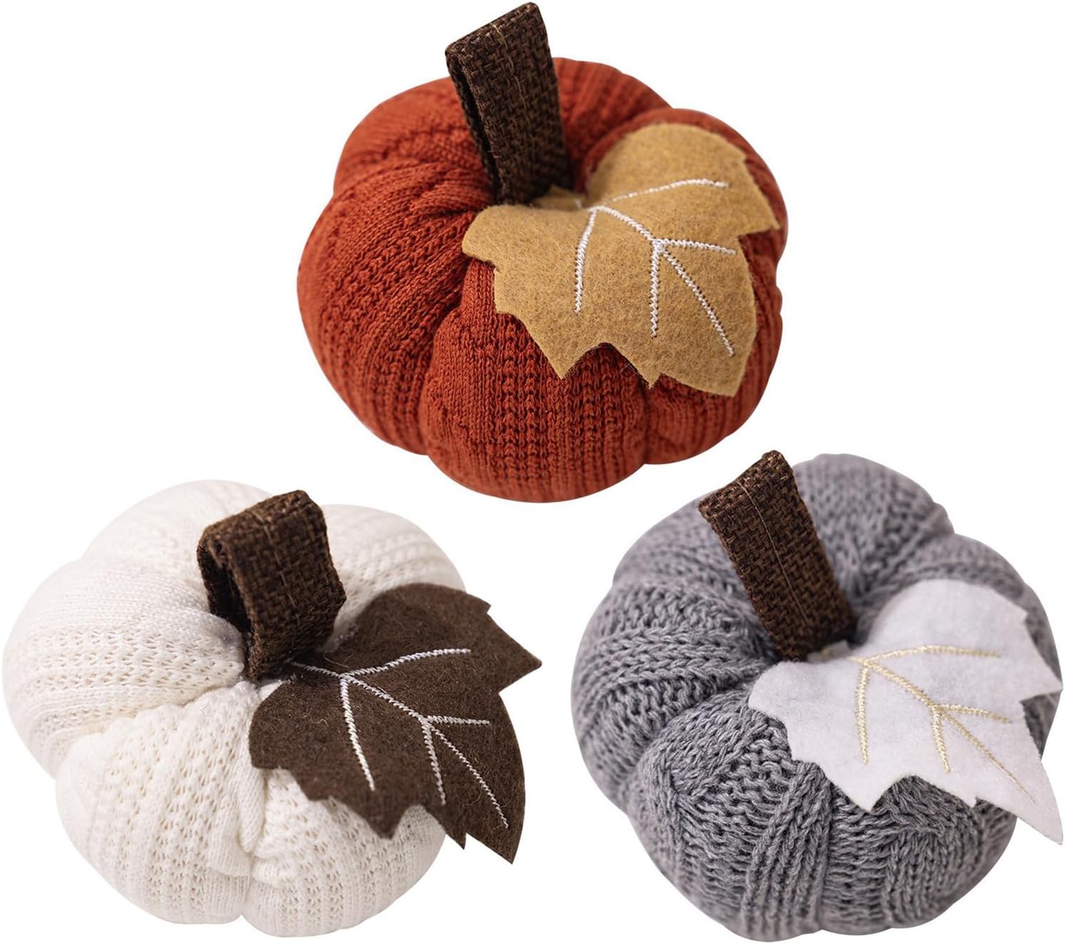 Packaging: You will receive 3PCS, One for each color ( red/white/gray) knitted pumpkin decorative ornaments, each about 3.5×2.4 inches, about half the size of an adult’s palm.v