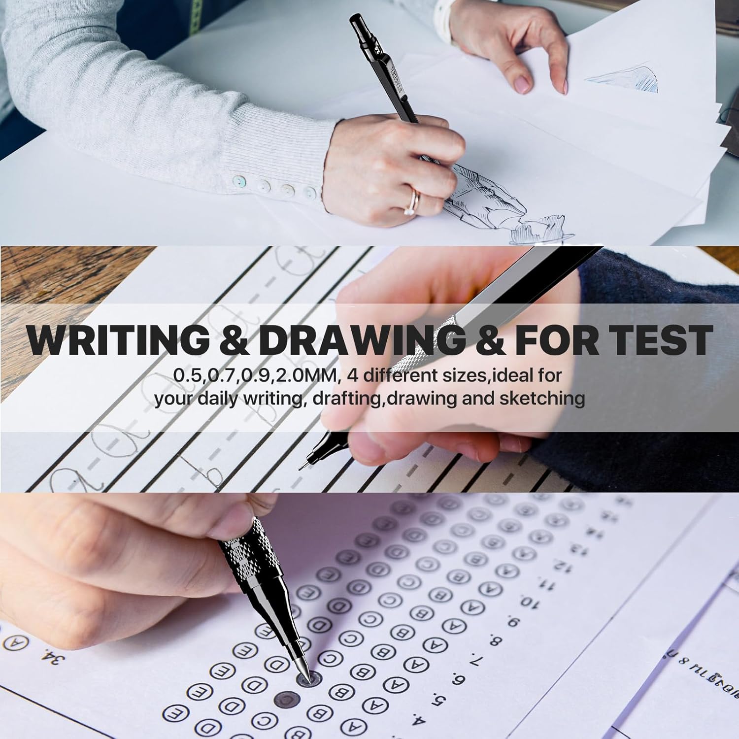 【Come with 4 Line Size and 6 Hardness】Our mechanical pencil set come with 4 size of lead refills for various line widths:0.5/0.7/0.9/2.0,the 2mm graphite pencil come with 6 hardness lead 6B 4B 2B HB 2H and 4H to create different darkness, perfect for your daily use, write smoothly, and don’t break easily
