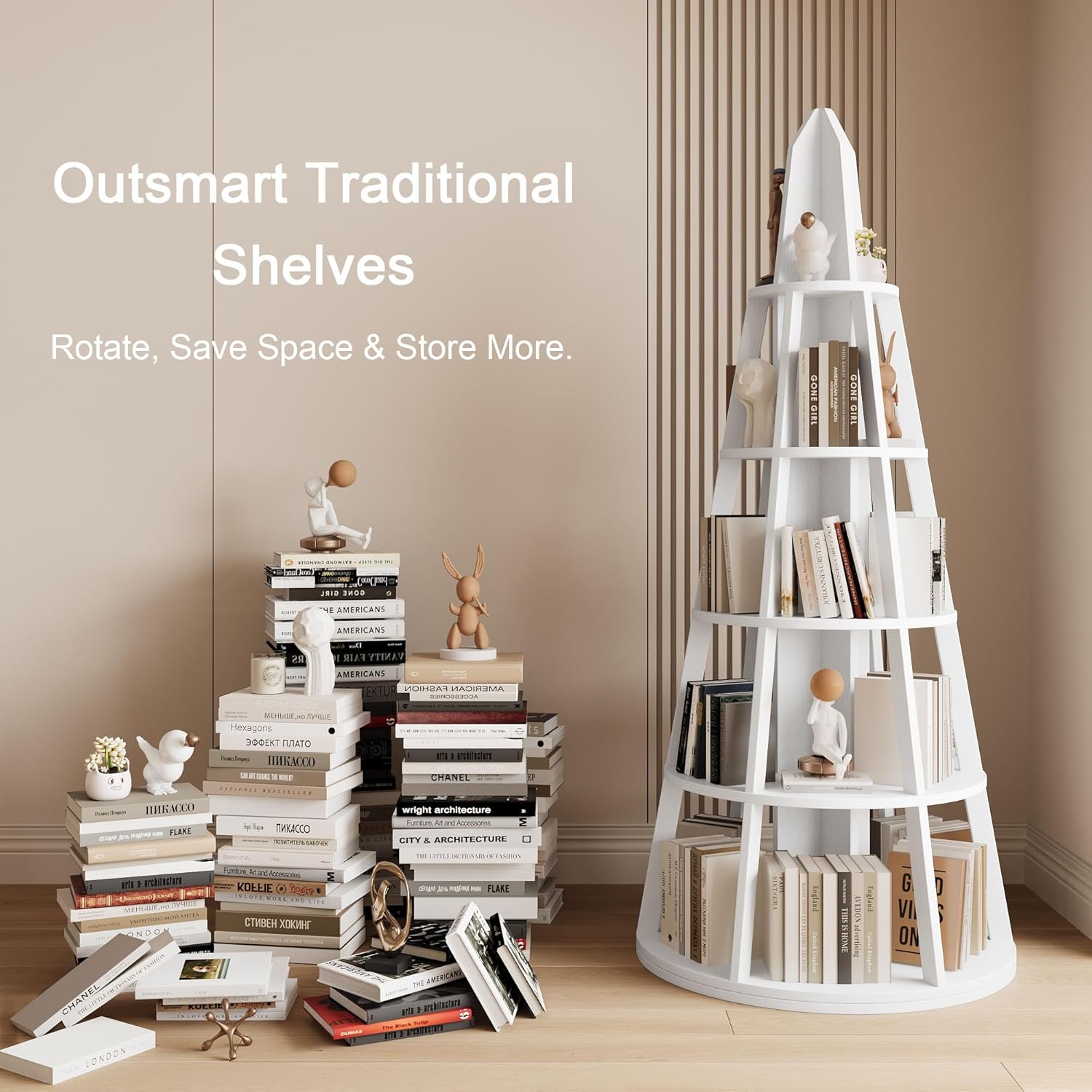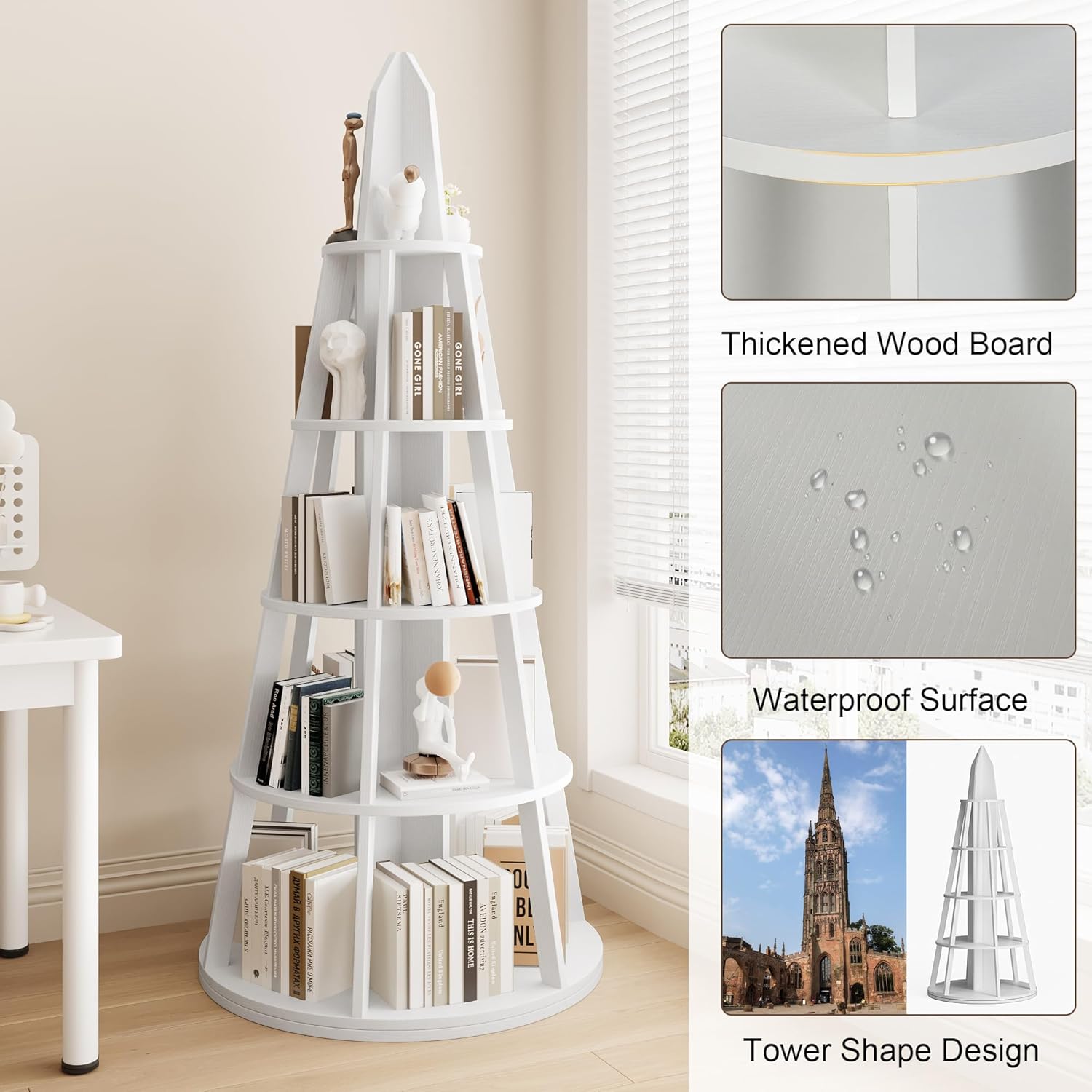 360° Spinning Tower Bookshelf: This five tier rotating bookshelf comes with a smooth turntable base that allows for 360° rotation. It enables your books, collectibles, and decorative items to be perfectly displayed from every angle. Turn your treasures into a stunning, stylish rotating showcase!