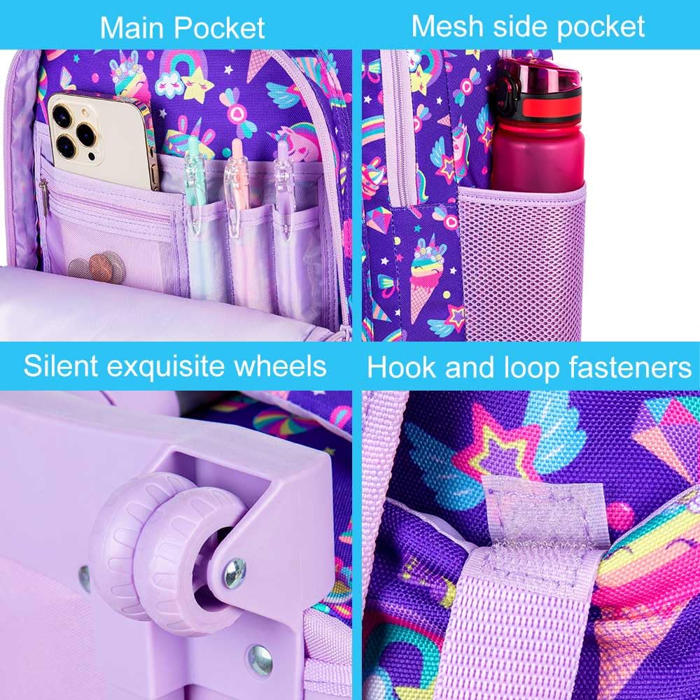 【Upgrade material】- We use high-quality durable materials to make the rolling backpack for girls set, giving the surface of backpack a water resisteant function that can protect your items from water damage.
