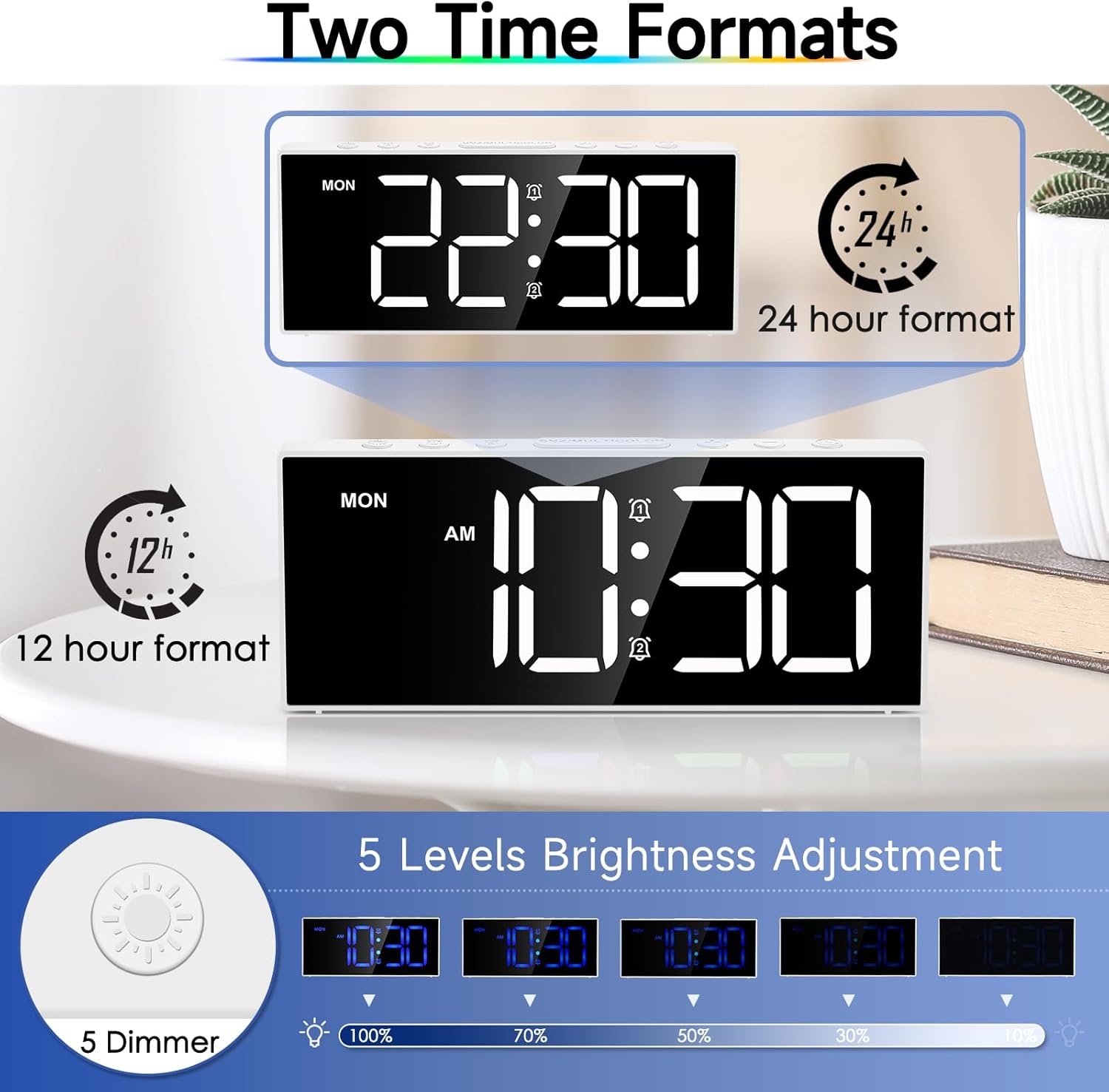 Big Digital clock 5 levels Adjustable Brightness:The Alarm clock features large and clear digits for easy reading from a distance, with adjustable 5-level brightness that protects eyesightand does not disturb sleep