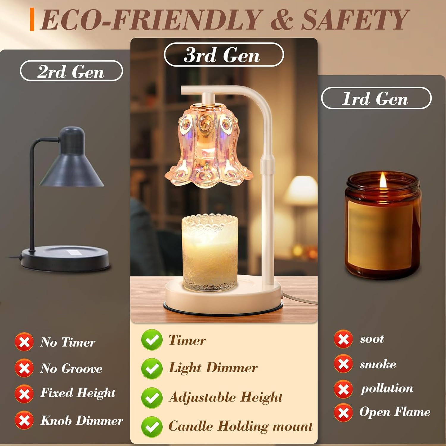 Use melted wax lamps which have no flame, no smoke, no soot and no pollution, giving you a safe and comfortable way to enjoy candles.