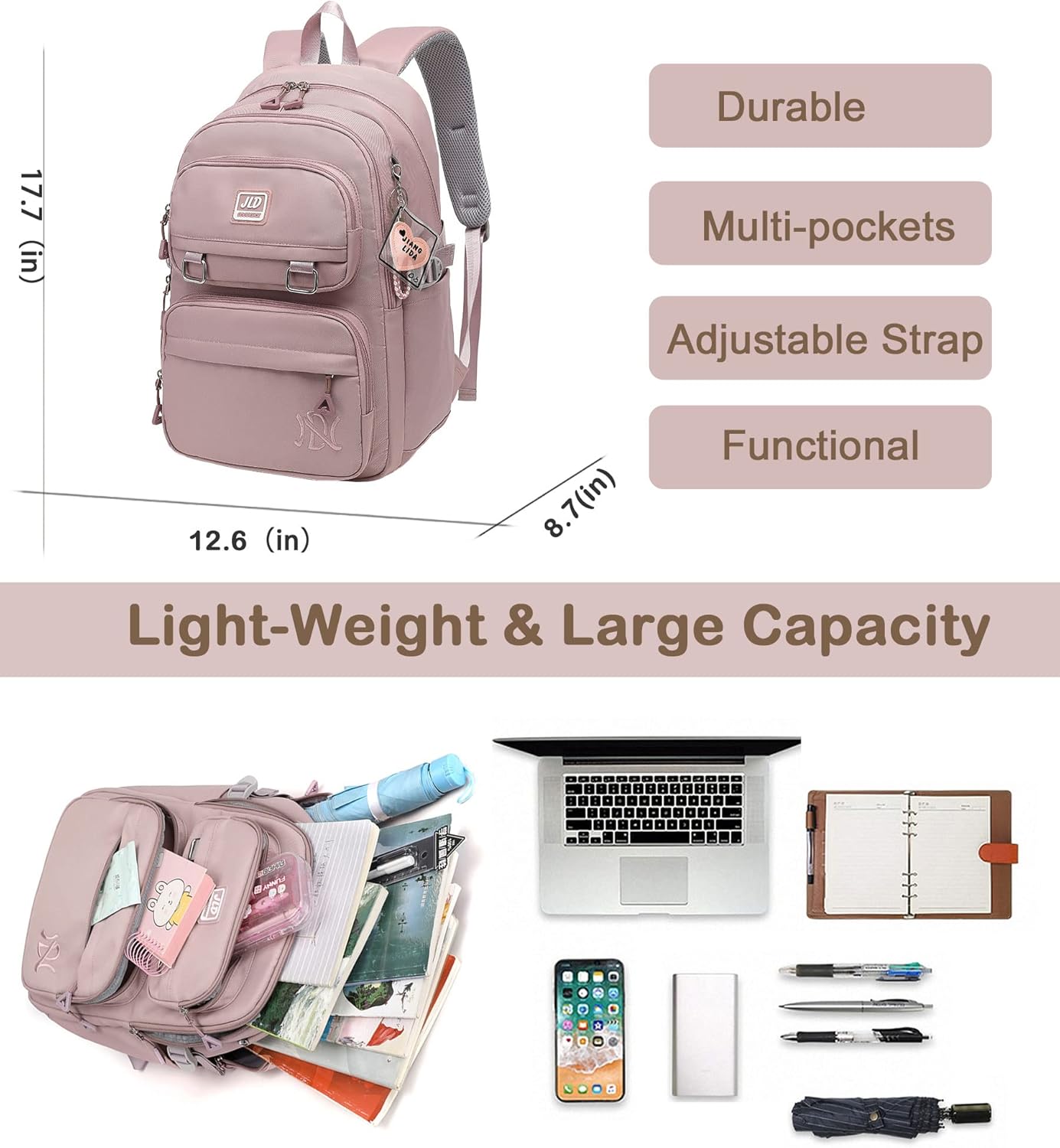 DIMENSION – The size of the backpack is about 12.6″ (W) x 8.7″ (D) x 17.7″ (H), weight about 0.75 kg. Enough space for daily items such as laptop, books, and other school essentials.