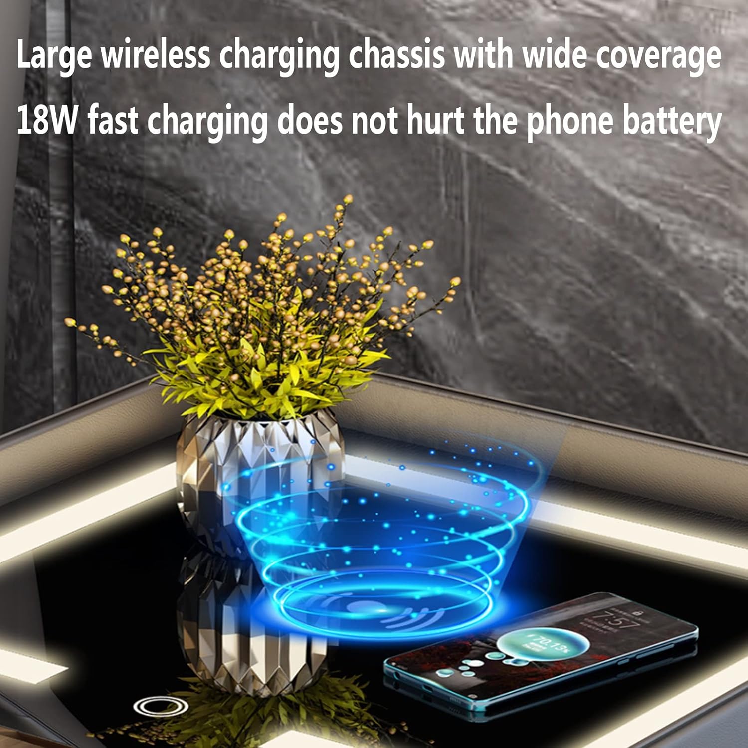 Another fantastic feature of our smart nightstand is its wireless charging capability. The charging pad is compatible with most smartphones, making it a versatile and convenient feature. You can now charge your phone without having to fumble with cables or adapters, providing a hassle-free and streamlined experience.