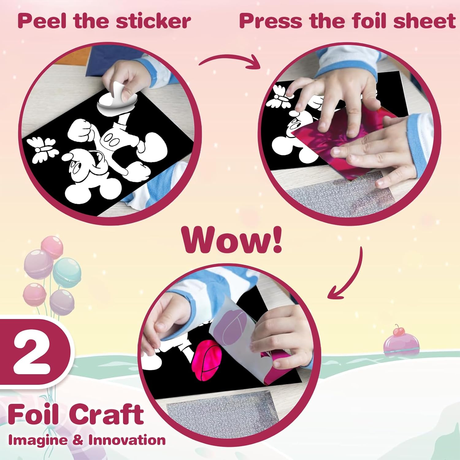 Easy to Use Foil Art Set: 1. Choose a pattern and peel off the protective film; 2. Use the shiny foil sheets to cover the sticky parts; 3. Press firmly and watch the magic!(Take care to use the correct side of the foil to stick to the sticky part. Foil art bulk is perfect to keep your kid busy and stimulate their creativity