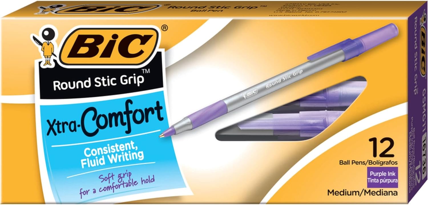 Featuring a soft grip for added comfort and control, the BIC Round Stic Grip Xtra Comfort Ballpoint Pen is designed for hours of comfortable writing, note-taking, or brainstorming sessions. The 1.2mm medium point offers the versatility needed to tackle a variety of writing applications. These dependable pens offer fluid, consistent writing with vivid lines, making them ideal for everyday use. This box includes 12 BIC Round Stic Grip Xtra Comfort Ballpoint Pens with purple ink. These pens are non-refillable.