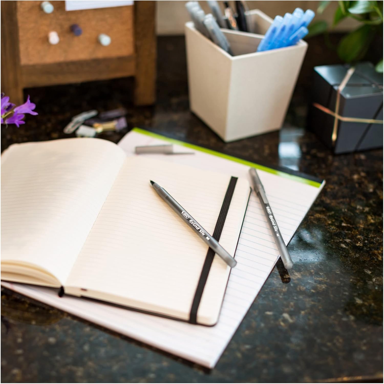 Combine exceptional performance and longevity with BIC Round Stic Xtra Life Black Ballpoint Pens. The flexible 1.0 mm medium point pens deliver crisp, legible lines, making these black ink pens a superb choice for everyday writing activities. BIC Round Stic Xtra Life Black Pens are the ideal smooth pens for writing — minimizing blotting and skipping as the tungsten carbide ball helps the black ink spread evenly. BIC Round Stic Pens have translucent, flexible round barrels that let you see how much ink remains. The matching cap includes a handy clip for easy attachment to pockets or notebooks. Write the first time, every time with BIC Round Stic Xtra Life Black Ballpoint Pens — the No.1 selling ballpoint pen*. Each black ink pen in this pack writes 90 percent longer compared to Paper Mate InkJoy 100 Ball Stick Pen**, providing a cost-effective option when restocking office supplies. *Source: The NPD Group/ U.S. Retail Tracking Service/ Actual Unit Product Line Sales (Retail and Commercial Combined)/ Annual 2020). **Paper Mate and InkJoy are trademarks of Newell or an affiliate. Newell has not sponsored or approved and is not affiliated with this BIC branded product.