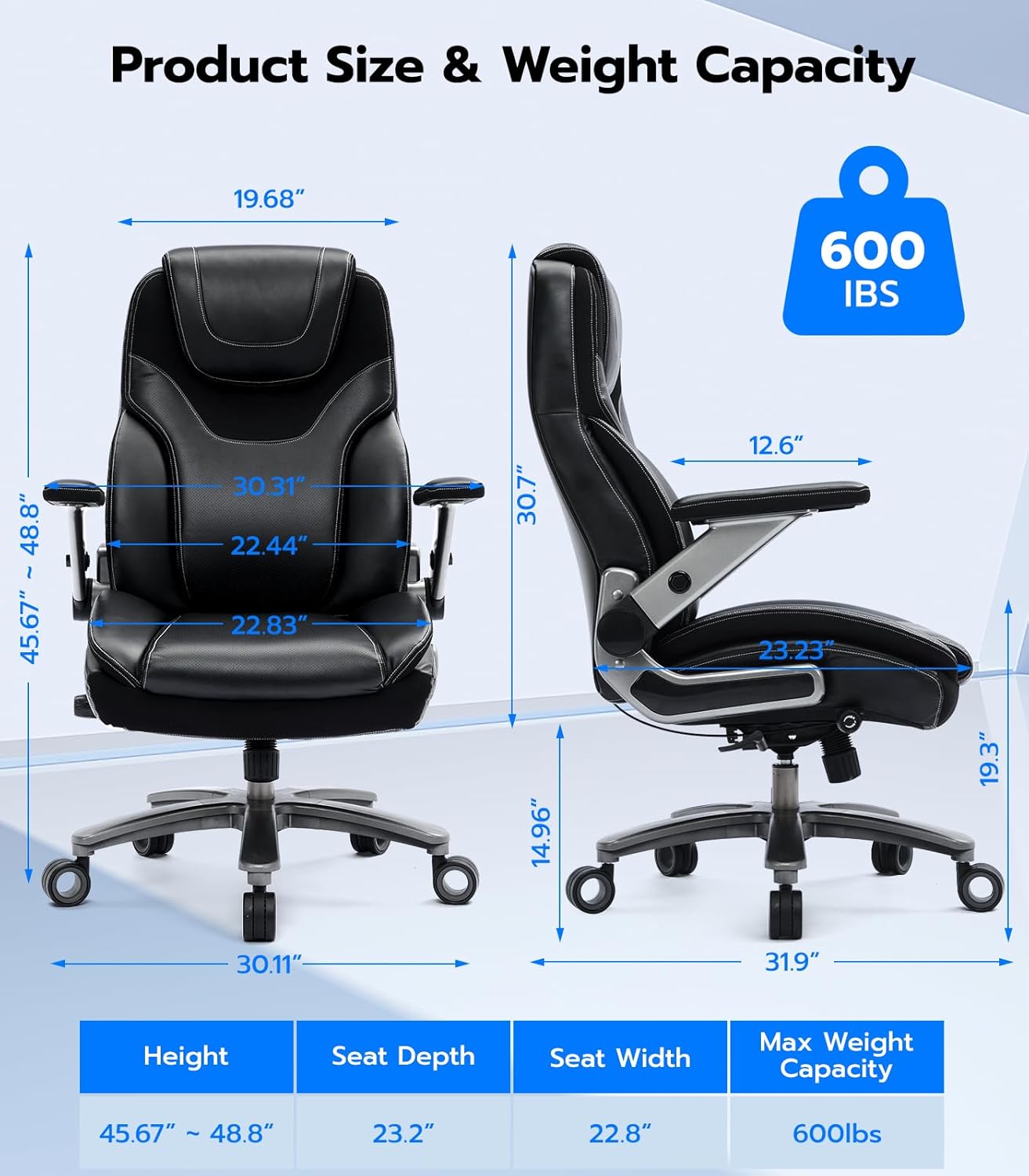 2. [ Hybrid Seat _ Cloud Comfort Meets Industrial Durability ]: This big and tall office chair is made of Premium PU leather with a blend of breathable fabric fiber mesh (37% improved airflow compared to all-leather) combines with a 2.36” spring-loaded memory foam base. Adapts to different seasonal temperatures and is warm in the winter and cool in the summer without the sticky feeling of leather. A textured surface provides optimal friction for stable postural control