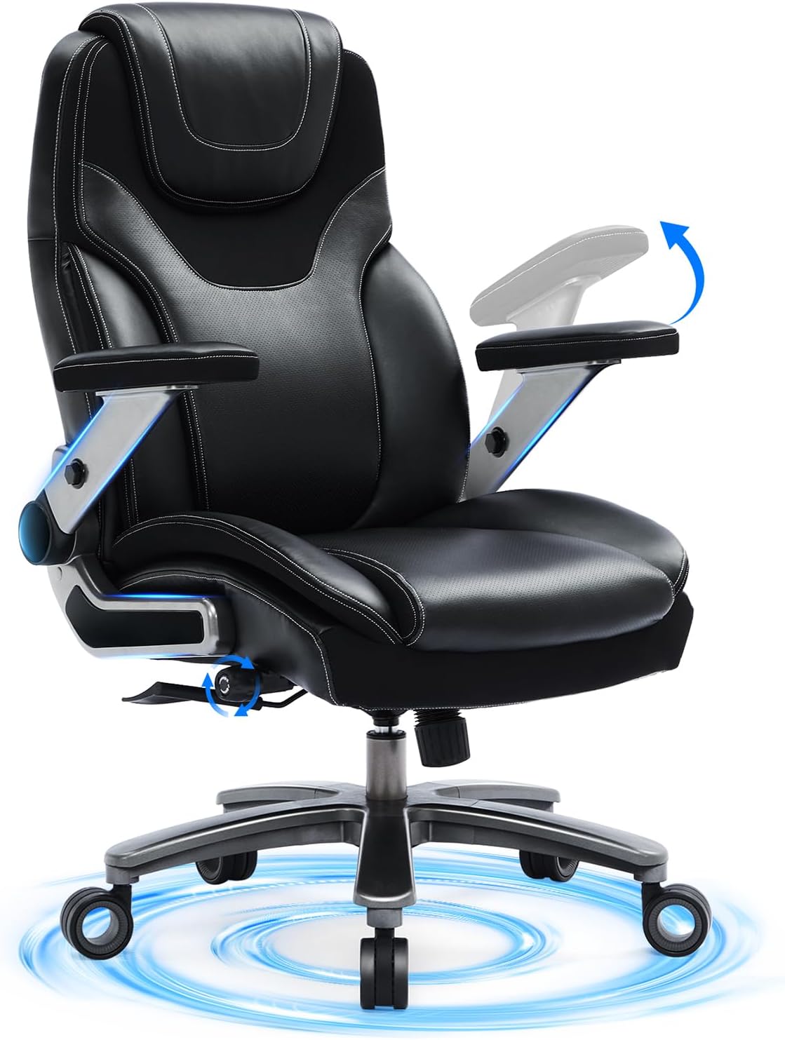 1. [ 5D Armrests_Robotic-Precision Ergonomics ]: The armrest of managerial home desk chair is engineered with 5-axis motion (up/down 2.56″, front/back 1.77″, 90° flip, 360° swivel and recline sync), these armrests adapt like industrial robotic arms. Seamlessly transition between keyboard work, tablet sketching, and reclined relaxation with millimeter-level control