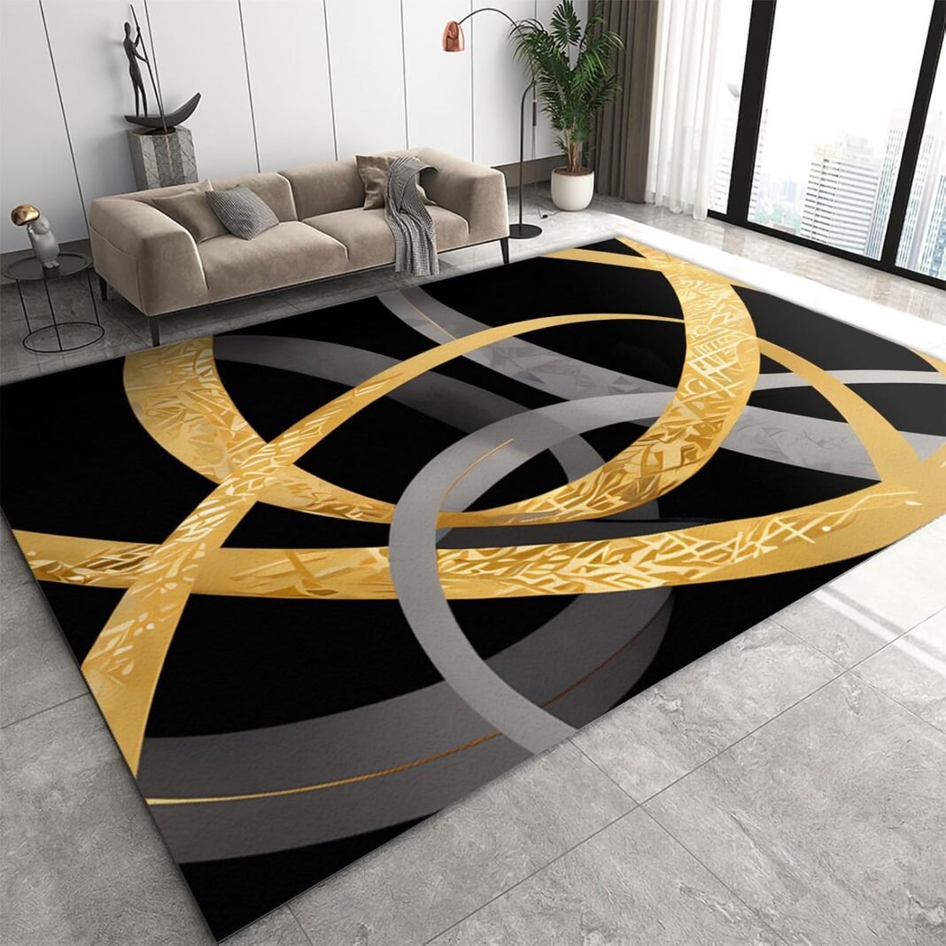 Black and Gold Geometric Lines Area Rug, Abstract Gray Irregular Curved Lines Indoor Non Slip Bedroom Rug, Machine Washable Carpet for Living Room Study Dining Room Floor Mat – 5 ft x 7 ft