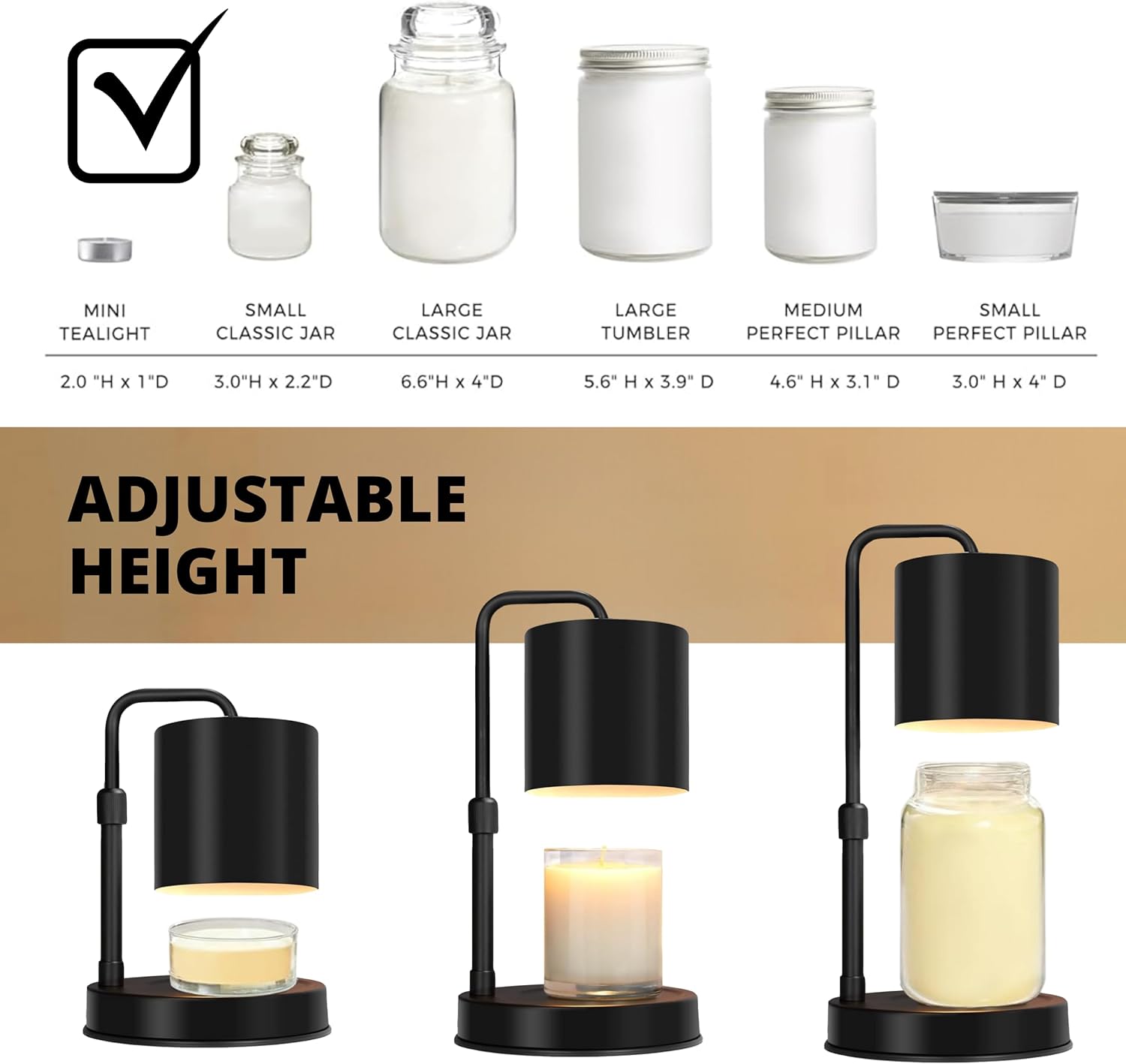 The height of the candle melter lamp can be adjusted from 10.6″ to 13.7″ and the base is 5.9″, suitable for most candle sizes. You can adjust the height, brightness and candle melting lamp time for a better candle wax melting experience. The 2-8 hour candle warmer timer functions provide the perfect mood and safe way to enjoy candles