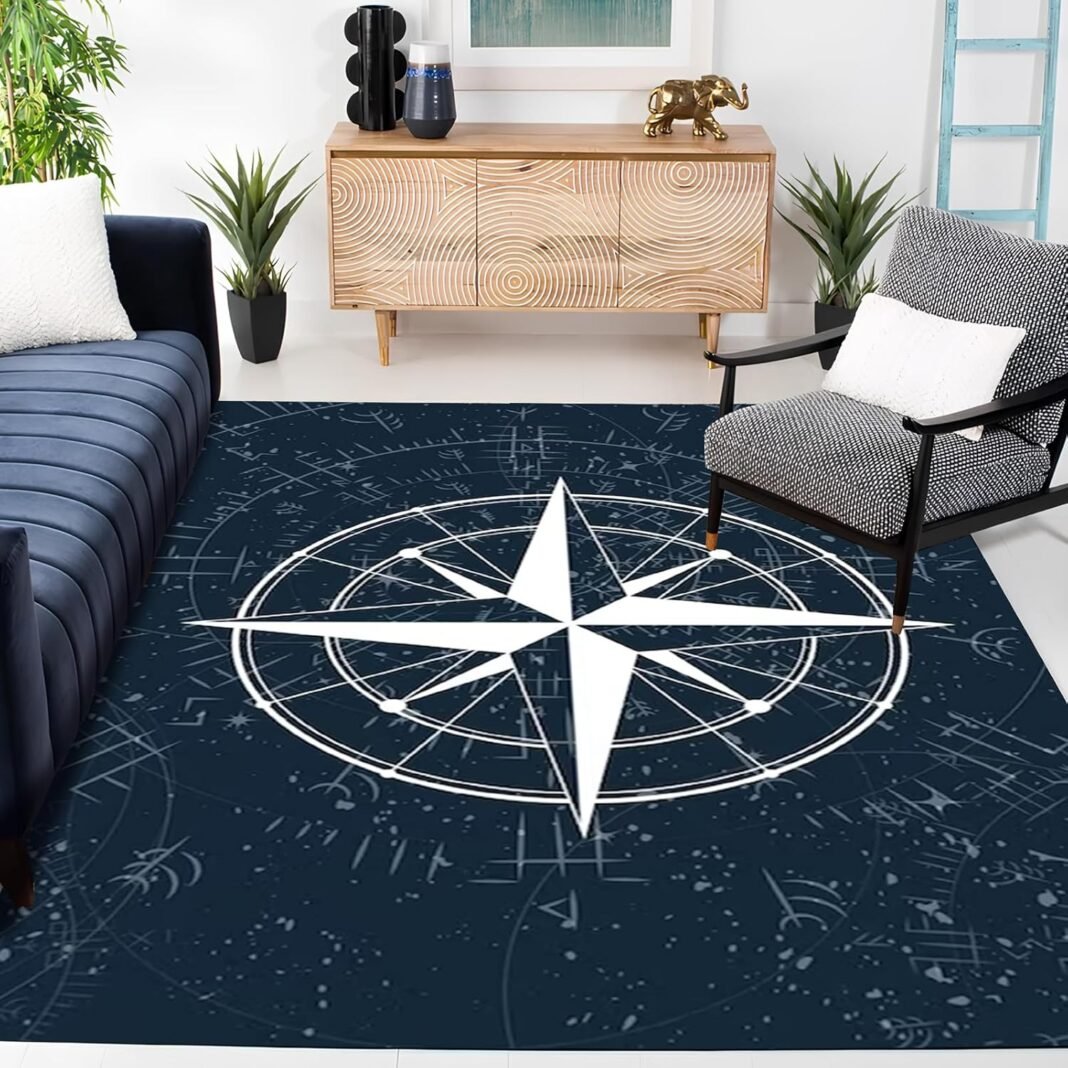 Blue Compass Pattern Printed Non-Slip Doormat, 5x8ft/60x96in, Nautical Theme Non-Slip Floor Mat Area Rug, Carpet for Bedroom Living Room Study Playing Carpet