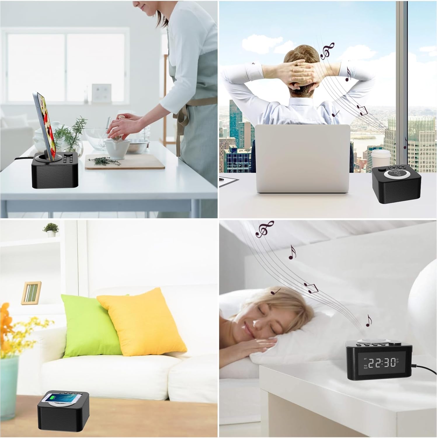 Multi-function speaker: [12/24 clock display], [alarm clock: ringtone, [snooze], [timed sleep], [desktop Bluetooth speaker], [speakerphone], [U disk MP3 player], [FM radio, need to plug in external antenna], [AUX], [EQ], [wireless charger], [USB-C fast charger], [mobile phone base charger] Please read the function description carefully before purchasing, so as not to buy wrong, there are good suggestions we will continue to optimize.