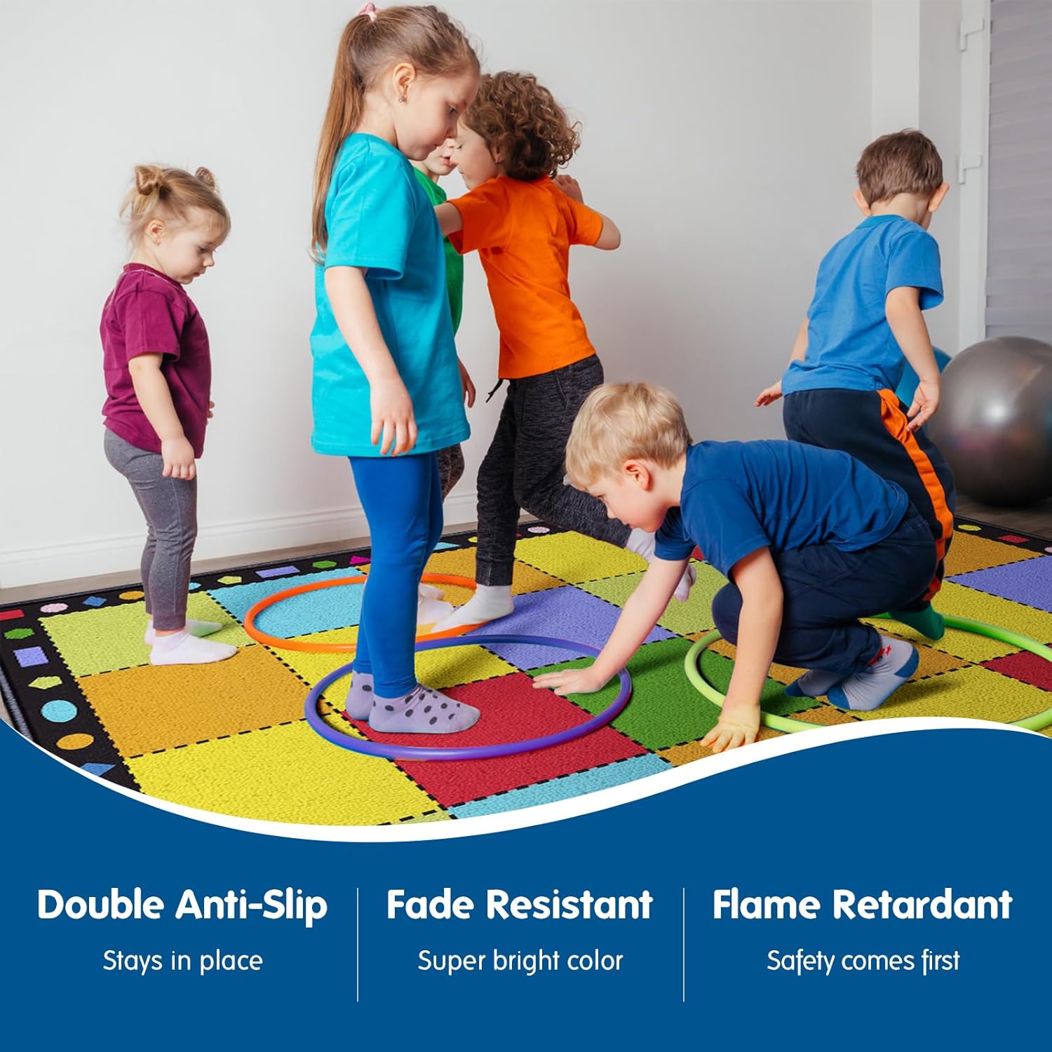 Interactive Tool for Active Learning-Designed with interactivity in mind, this classroom rug is perfect for encouraging group activities, storytime, and collaborative learning sessions. The vibrant colors and individual seating areas allow for fun games or color-based activities, promoting participation and engagement. Teachers can utilize the distinct colored squares for activities that help children learn through movement and interaction