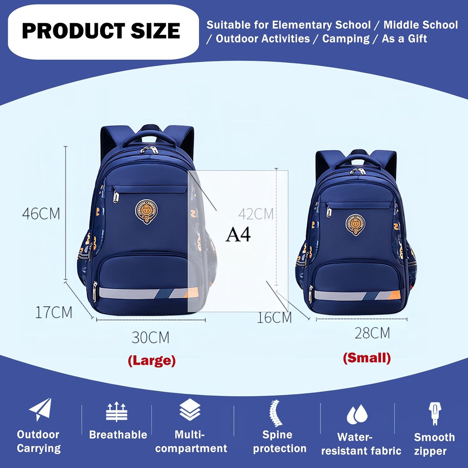 Large Capacity: Small Size:28*16*42cm/11.02*6.3*16.54inch; Large Size: 30*17*46cm/11.81*6.69*18.11inch. We recommend the small size for ages 6-8 and the large size for ages 8-12. The backpack has enough space for daily needed items, 4 exterior pockets and 2 elastic side pockets, multi-pocket compartment design, which can make your child develop a good habit of organizing and storing.