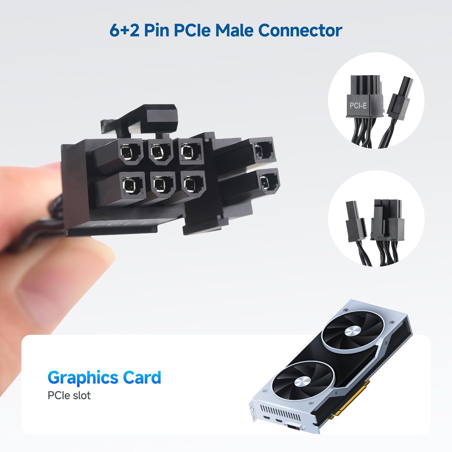 Graphics Card Compatibility: Perfect for powering high-performance graphics cards, this cable features a 6+2 pin PCIe connector that can be used with both 8 pin and 6 pin GPU interfaces, making it a versatile solution for varying power requirements.