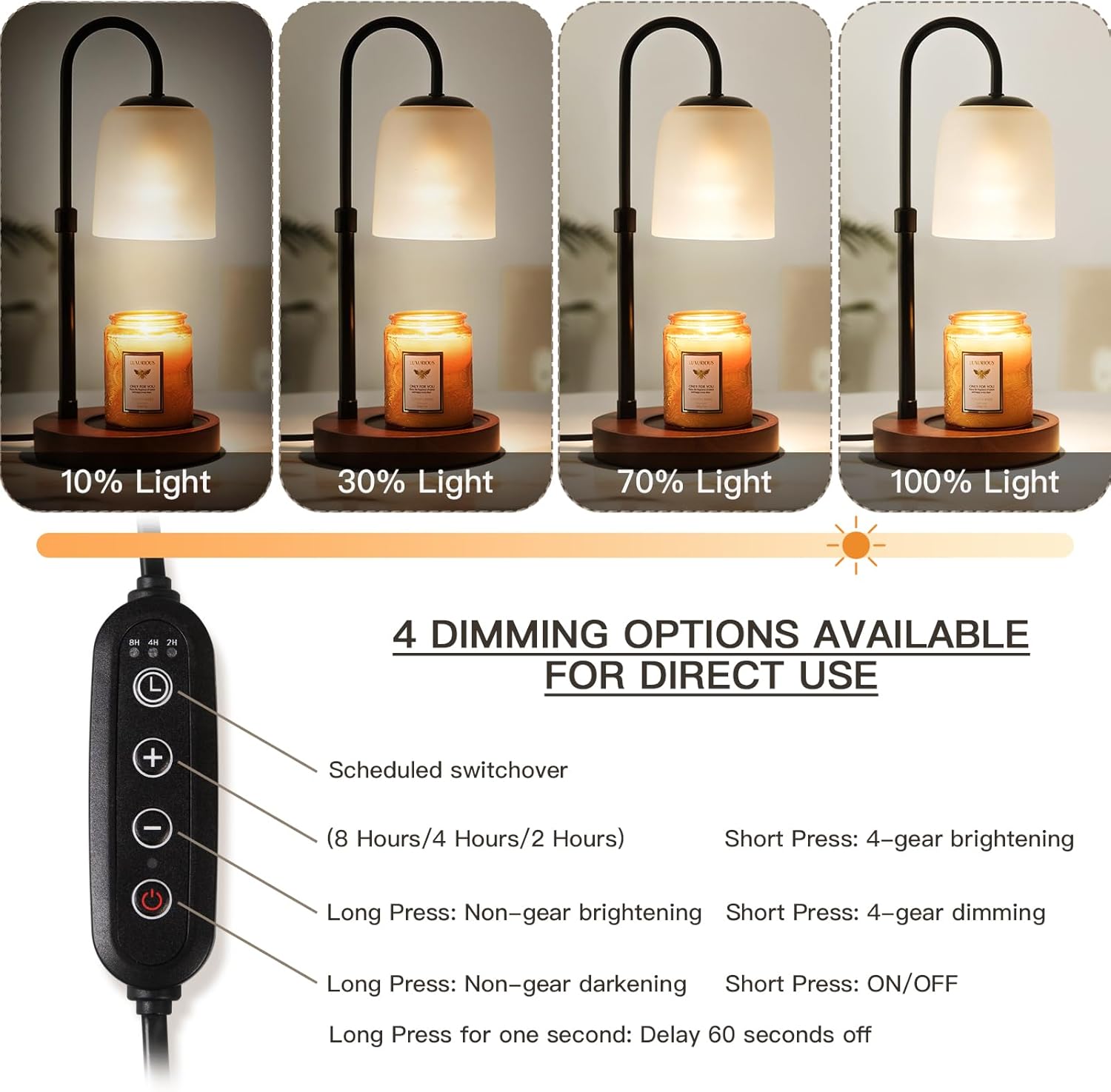 【Dimmable & Timer Settings】With 4 levels of brightness adjustment and 2/4/8 hours setting timer, you can customise the heat release and melting speed of the candle to cater for different scent concentrations and wax life. In addition, you can have a good night’s sleep without worrying about accidents or overheating candles.