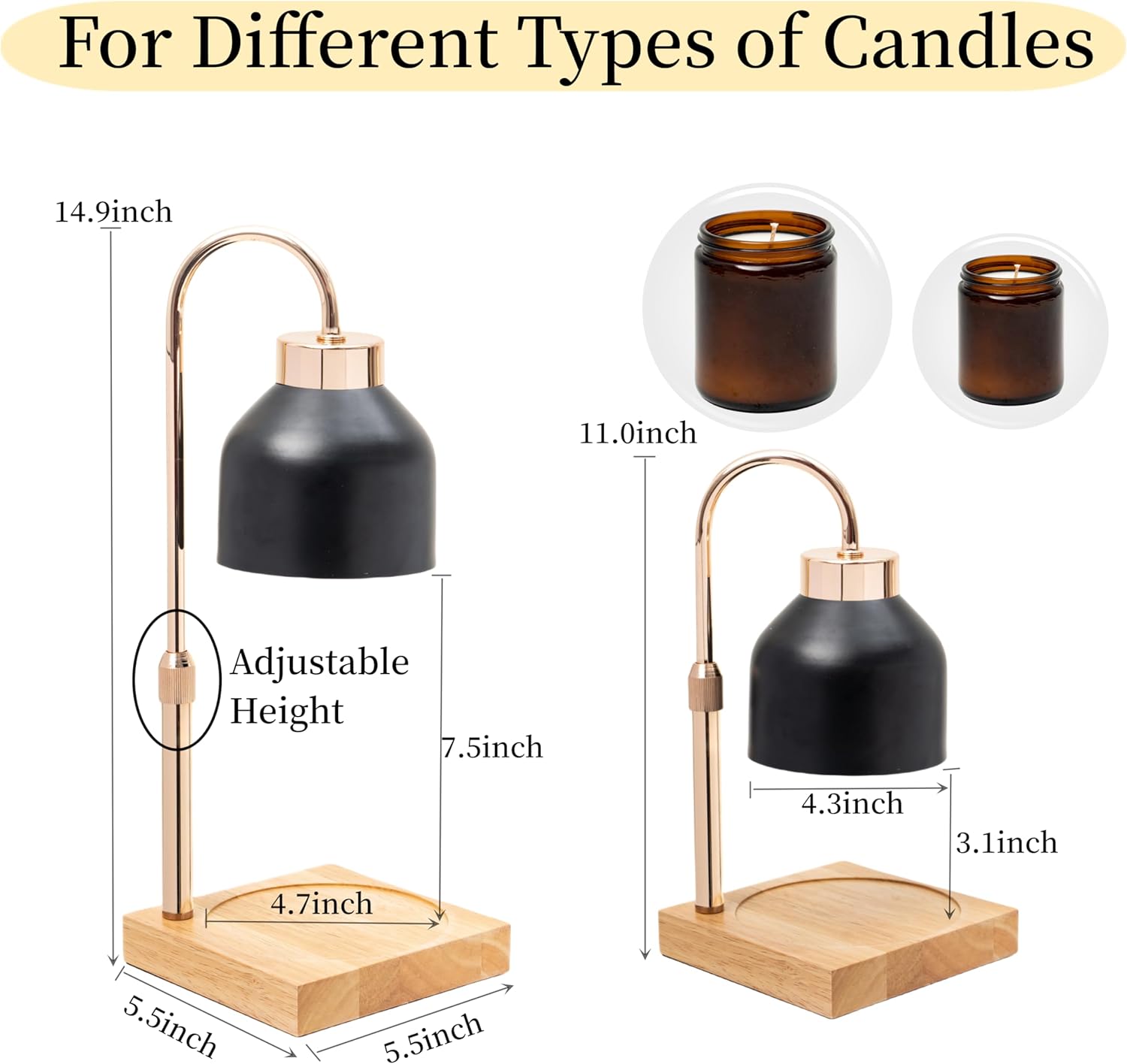 Compatible with jar candles of various types and sizes.Adjustment height for Wax Melt Warmer lights between 11” and 15”