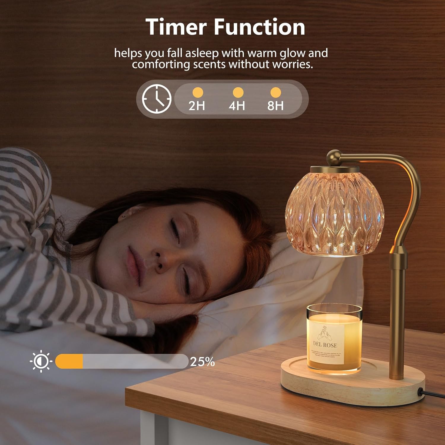 【Candle Lamp with Timer & Dimmer】Adjust the wax melting speed to release fragrances of varying intensities, prolonging the life of your favorite candle. This smart bedroom decor allows you to adjust the light’s brightness to fit for various moods. Set the mood with customizable brightness levels for any occasion, and let the timer feature effortlessly switch off the lamp after 2, 4, or 8 hours, allowing you to unwind and drift into peaceful slumber worry-free.
