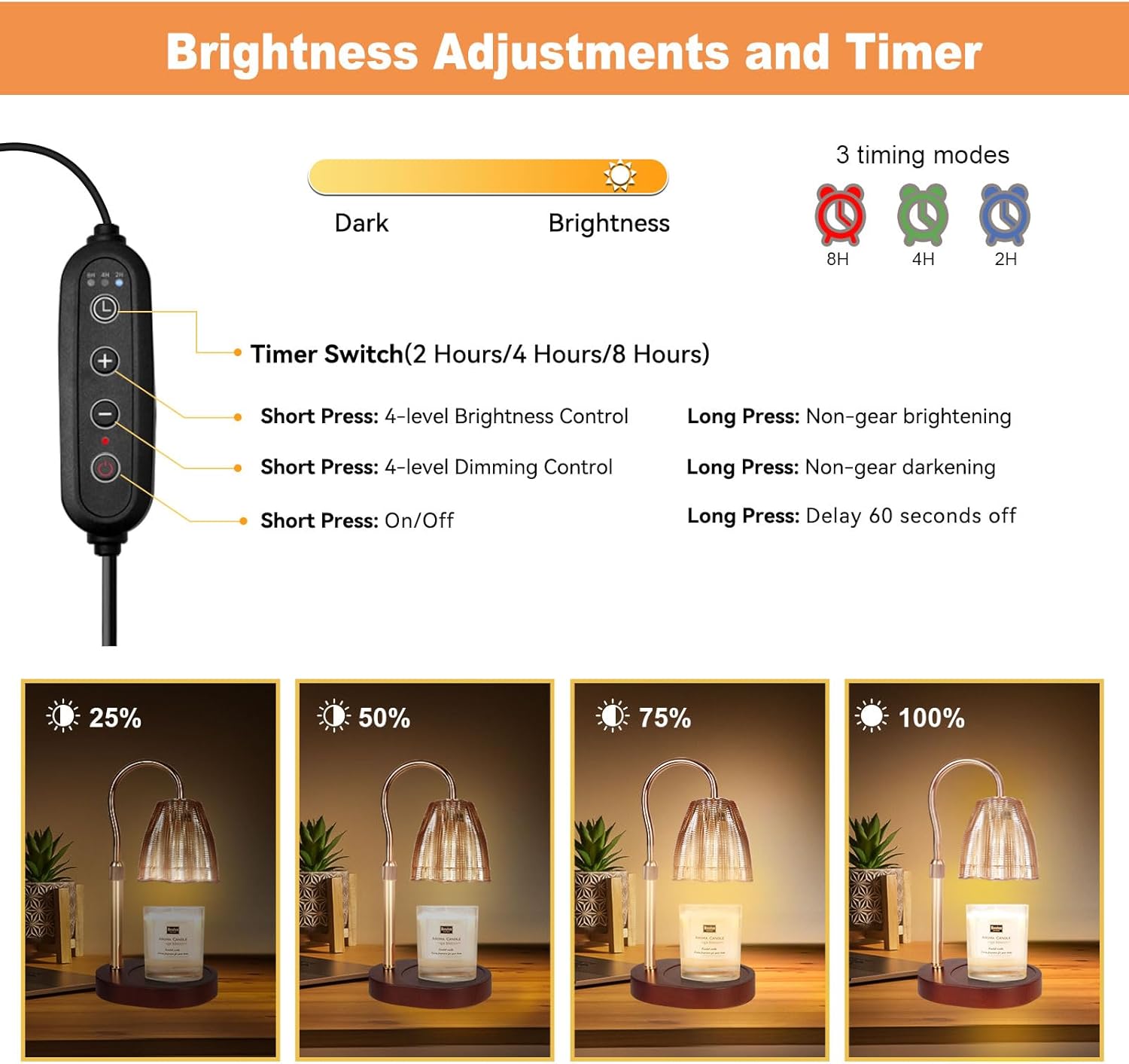 Timer and Dimming Function: Our candle warmer lamp features adjustable brightness and a timer. By adjusting the brightness of the candle warmer light, you can control the melting speed of the candle, influencing both fragrance intensity and the candle’s lifespan. Additionally, our candle warming lamp offers peace of mind with its automatic shut-off feature, which can be set for 2, 4, or 8 hours, ensuring safety and convenience.