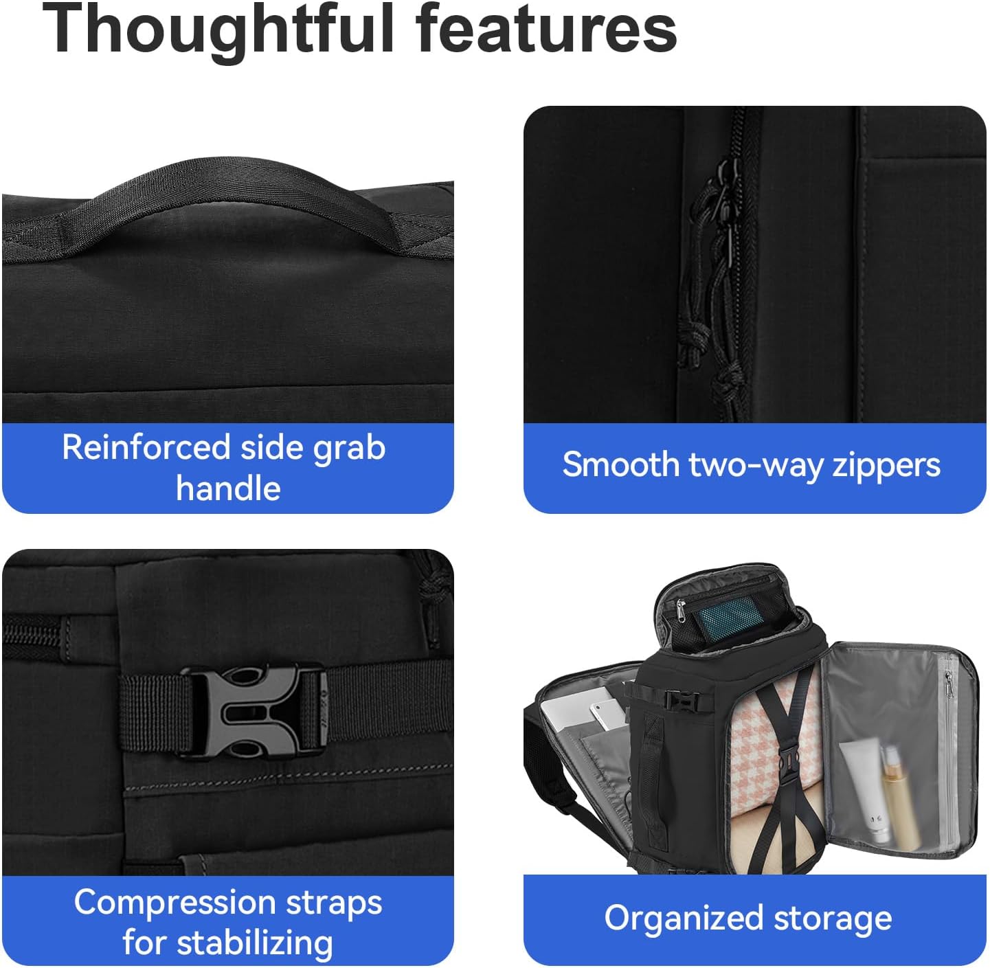 【HIGH QUALITY MATERIAL】Crafted from water-repellent nylon, this carry on travel backpack effectively shields contents from rain and humidity. The breathable back of the flight approved travel backpack features soft padding for optimal support, while adjustable shoulder straps ensure comfortable carrying. Built with robust zippers and reinforced stitching for lasting durability.