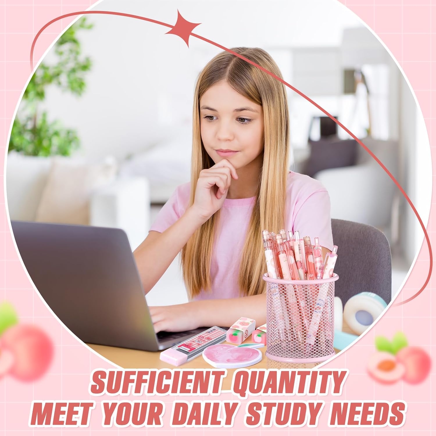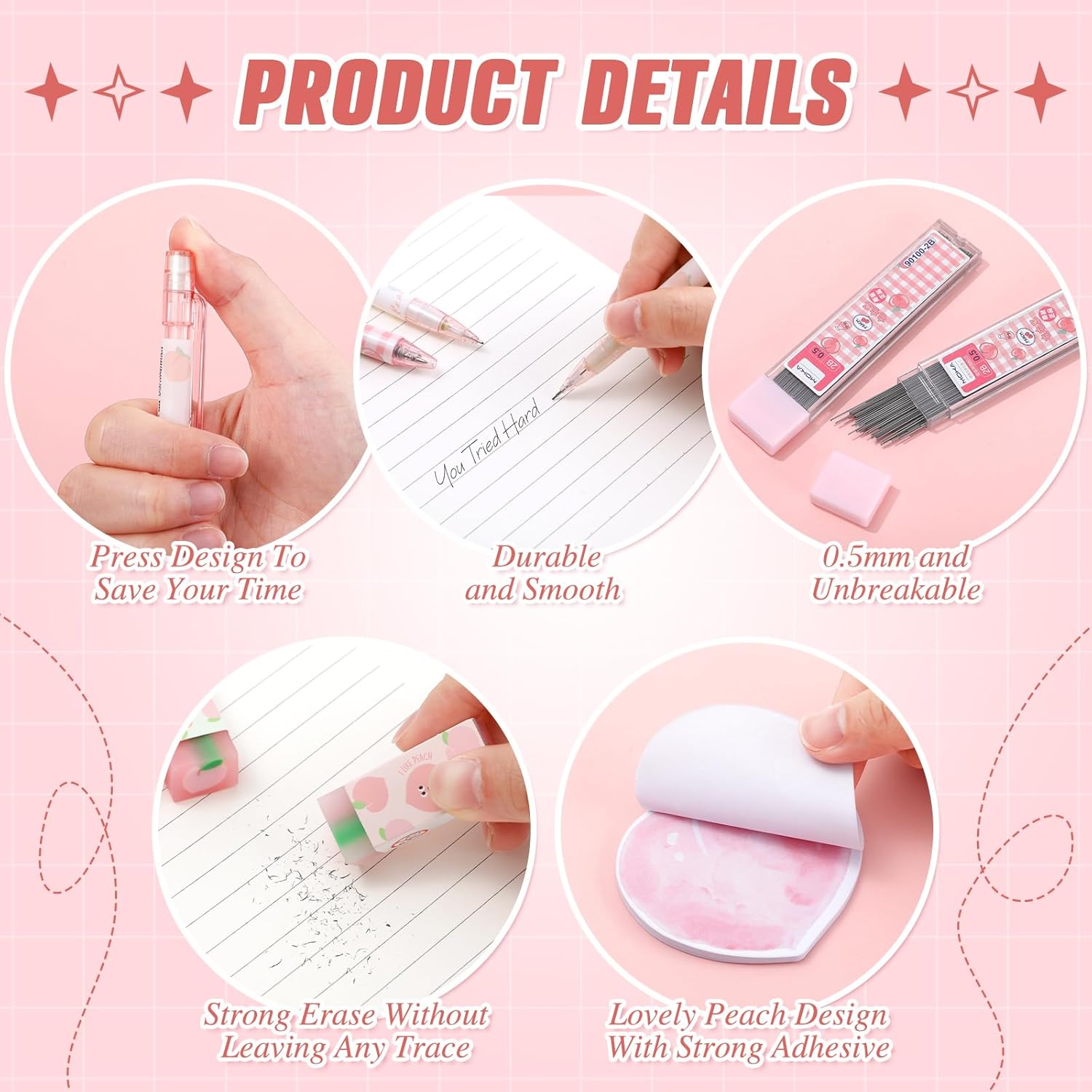 What You Will Get: 6 cute pink peach pens 0.5 mm black ink pens with clips, 6 peach automatic pencils, 6 peach pencil lead, 3 peach erasers, 2 peach sticky notes set; We have removed inappropriate stickers