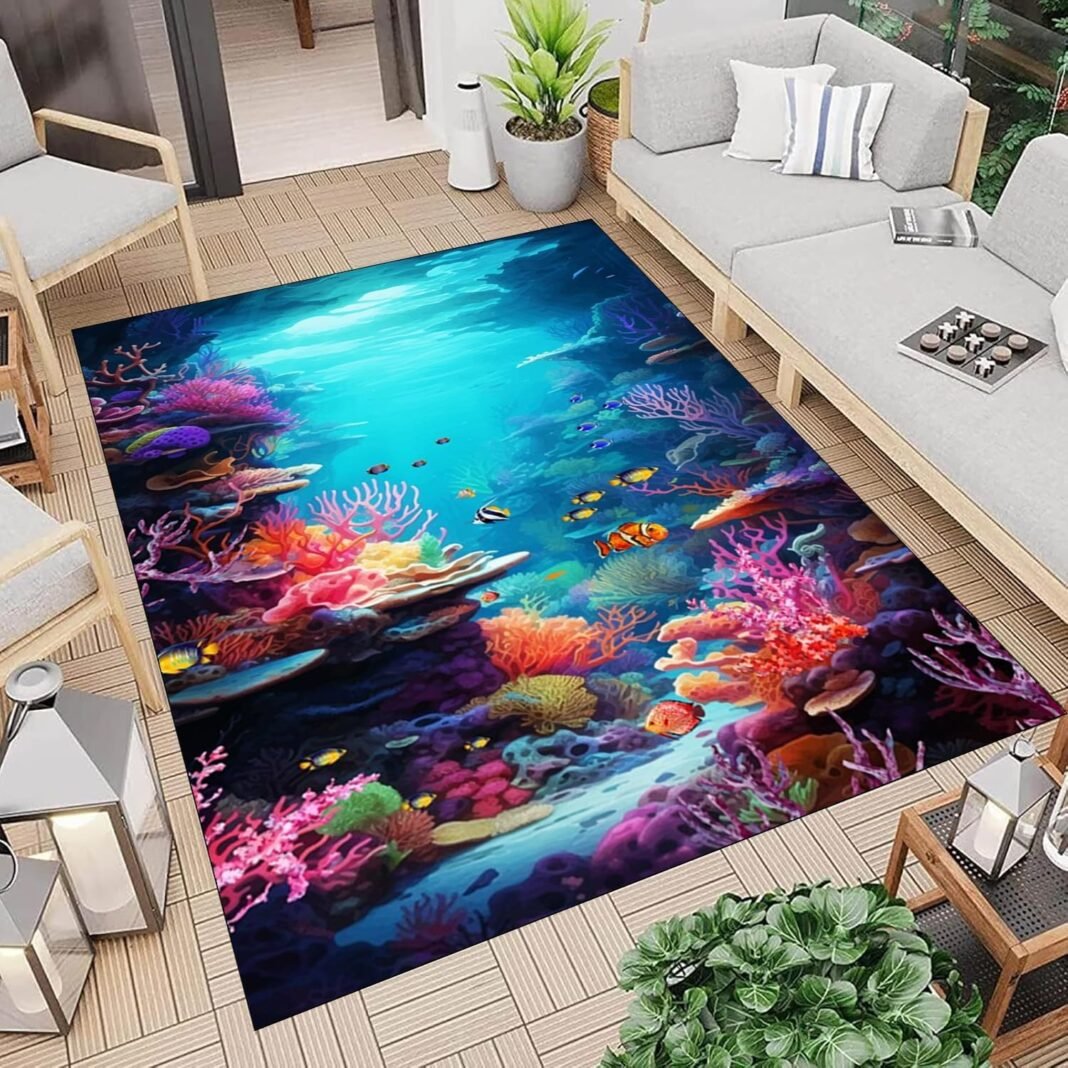 Colorful Underwater World Area Rug,5x7ft Marine Life Rugs,Indoor Ocean Rug,Fish Rugs,Soft, Non-Slip Machine Washable Mat,for Living Room, Bedroom, Study,Office and Restaurant.