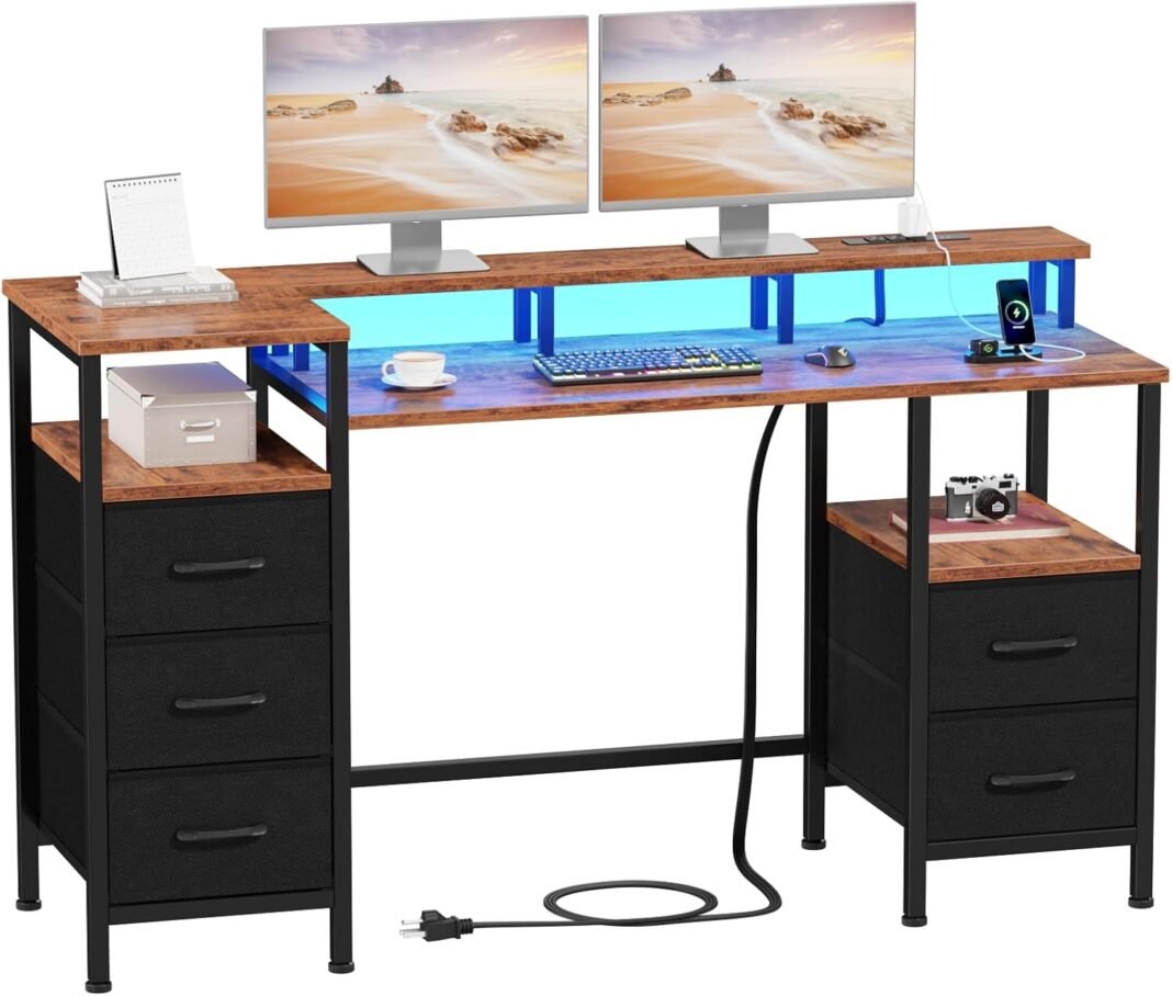 Computer Desk with Power Outlets & LED Lights, Reversible Gaming Desk with 5 Fabric Drawers for Bedroom, 47 Inch Home Office Desk with Monitor Stand & Storage Shelves for Working, Rustic Brown