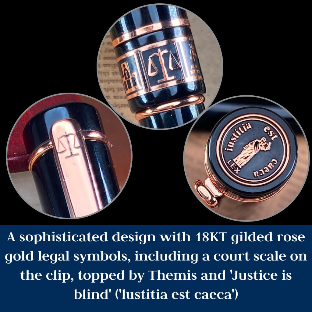 The pen’s sleek black body, made from European-grade hand-crafted resin, is elegantly complemented by 18K rose gold-plated elements. These accents include symbols of justice, such as the scales of justice and the gavel, reflecting the pen’s deep connection to the legal field and its role as a tool of justice.