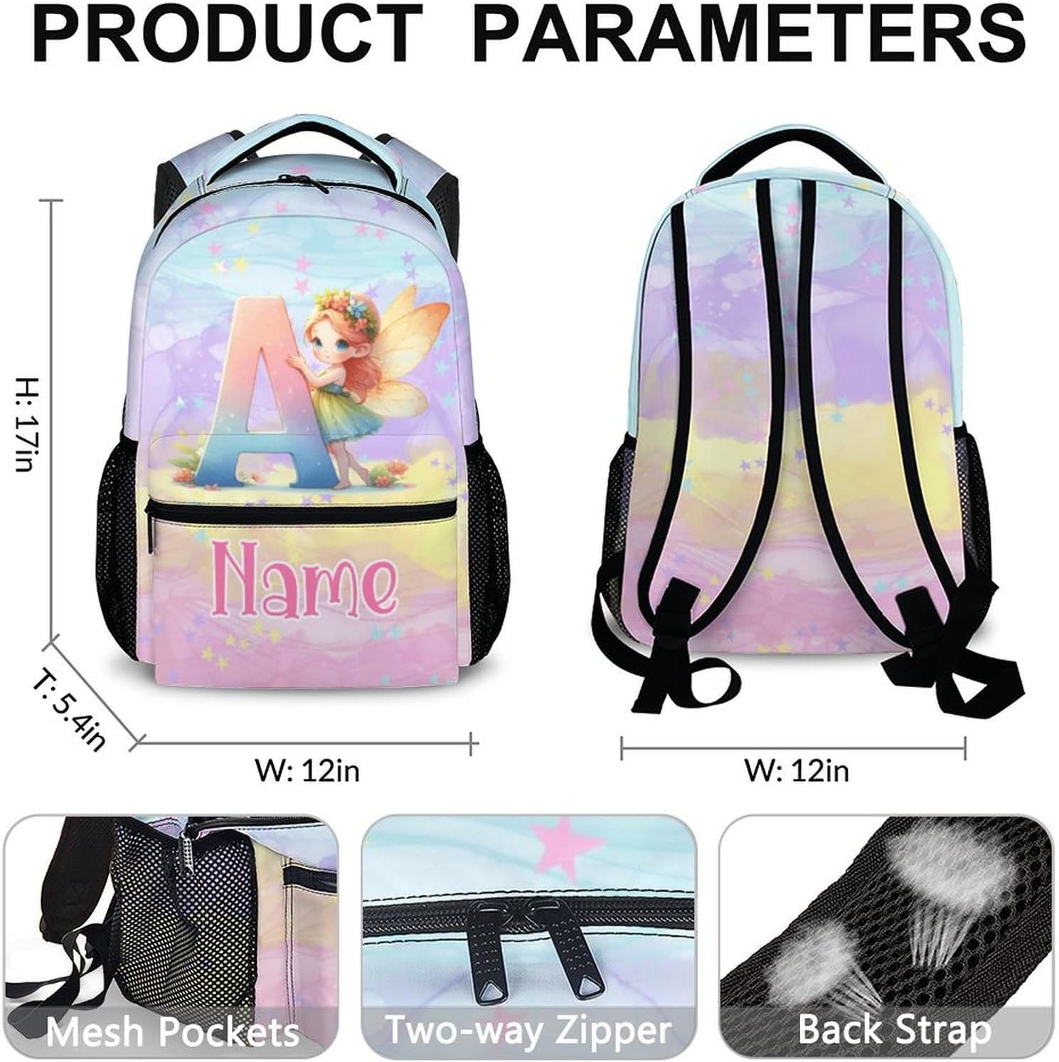Easy to Orangize: fairy patterns print backpack provides roomy space for storage. Most of daily necessities can be loaded, such as folder, water bottle, notebook, lunch box, extra clothes, etc. Plus, there are 2 mesh side pockets used as water bottle holder. Those different compartments and pockets will help keep you organized