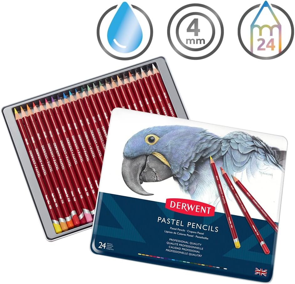Includes a well balanced collection of Derwent artist quality 24 wood-cased pastel pencils set in a convenient and secure hinged metal tin