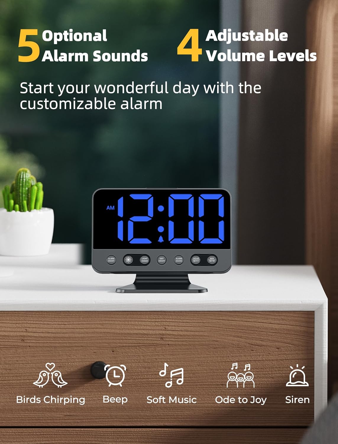 Extra Loud Alarm Clock with 5 Wake-Up Sounds: Featuring an alarm volume of up to 110dB, this clock is perfect for heavy sleepers and also accommodates light sleepers with an adjustable volume range from 30 to 110dB. Choose from 5 built-in wake-up sounds (Birds Chirping, Beep, Soft Music, Ode to Joy, Siren), which gradually increase in volume from gentle to your preferred level. Snooze allows extra 9 minutes of slumber.