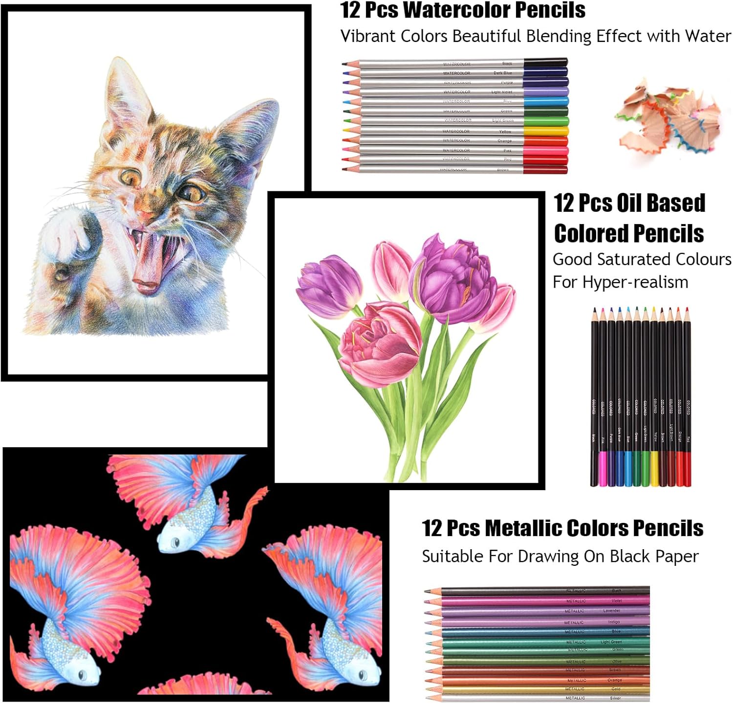 【All-in-one Professional Drawing Sketching Kits】: 78 Pack Art Pencil Set include 12 sketch pencil, 12 metallic coloured pencils, 12 water-based coloured pencil, 12 oil-based coloured pencil, 12 charcoal pencil, 12 sandpaper board, 1 pencil extender, 3 paper eraser, 1 art kinfe, 1 felt-tip pen, 1 white charcoal, 1 graphite pen, 1 vinyl erasers, 1 kneaded erasers, 1 water brush pen, 1 brush pen, 1 single hole pencil sharpener, 1 double hole sharpener, 1 marker, 2 sketchbook, 1 canvas storage bag, Perfect for drawing, sketching, shading, layering, blending, and more.