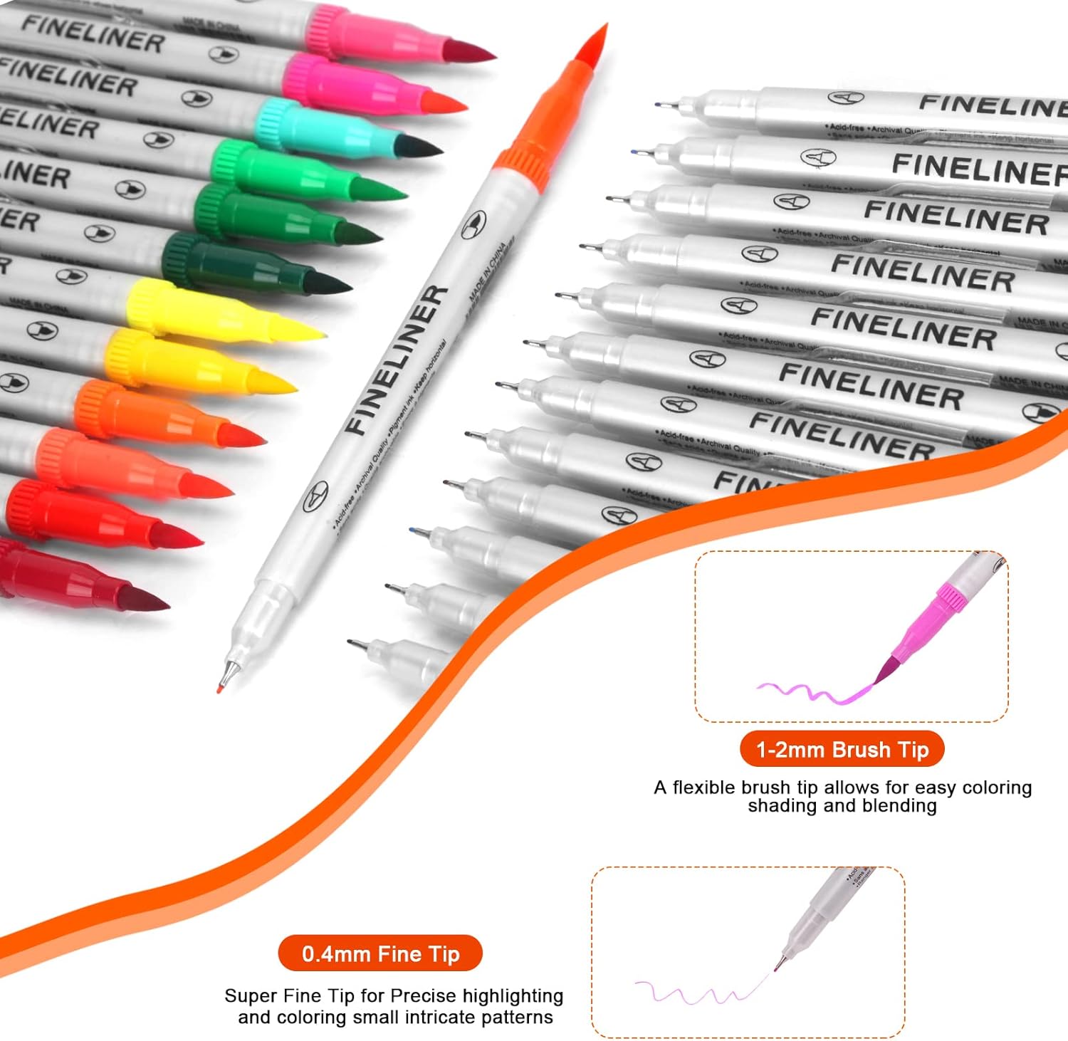 【DOUBLE TIPS, DOUBLE CREATIVITY, DOUBLE FUN 】WHY CHOOSE Our 12 brush marker pens set? We’re different! 1. Double tips, 12 markers, 24 nibs, brush & fine tips! 2. Well selected vibrant colors, NO duplicate. 3. Minimal to No Bleed Thru most paper! 4. Premium High Quality Control Promised