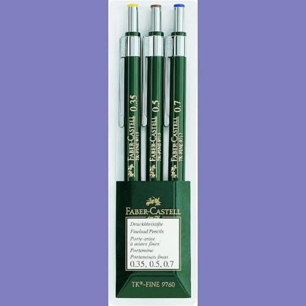 Faber-Castell TK-Fine Lead Mechanical Pencils are classically styled professional pencils with a full set of features; The Faber-Castell TK-Fine has a pocket-safe fully-retractable lead sleeve, colour-coding for lead width, adjustable lead-grade indicator, eraser with cleaning pin and a metal pocket clip. This wallet of 3 comes with 0.35mm, 0.5mm and 0.7mm nibs.