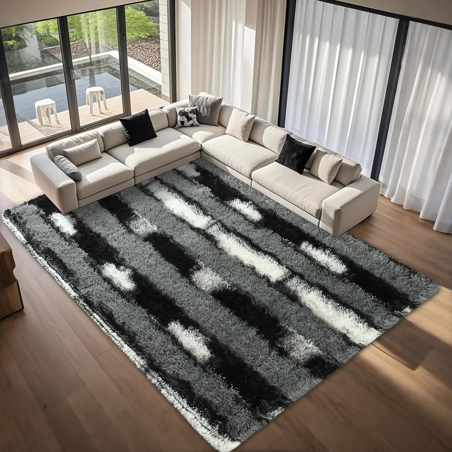 Fluffy Area Rugs for Bedroom Living Room, 4×6 Black and Grey Soft Plush Striped Rug, Modern Indoor Non Slip Washable Carpet, Furry Throw Carpets for Home Decor