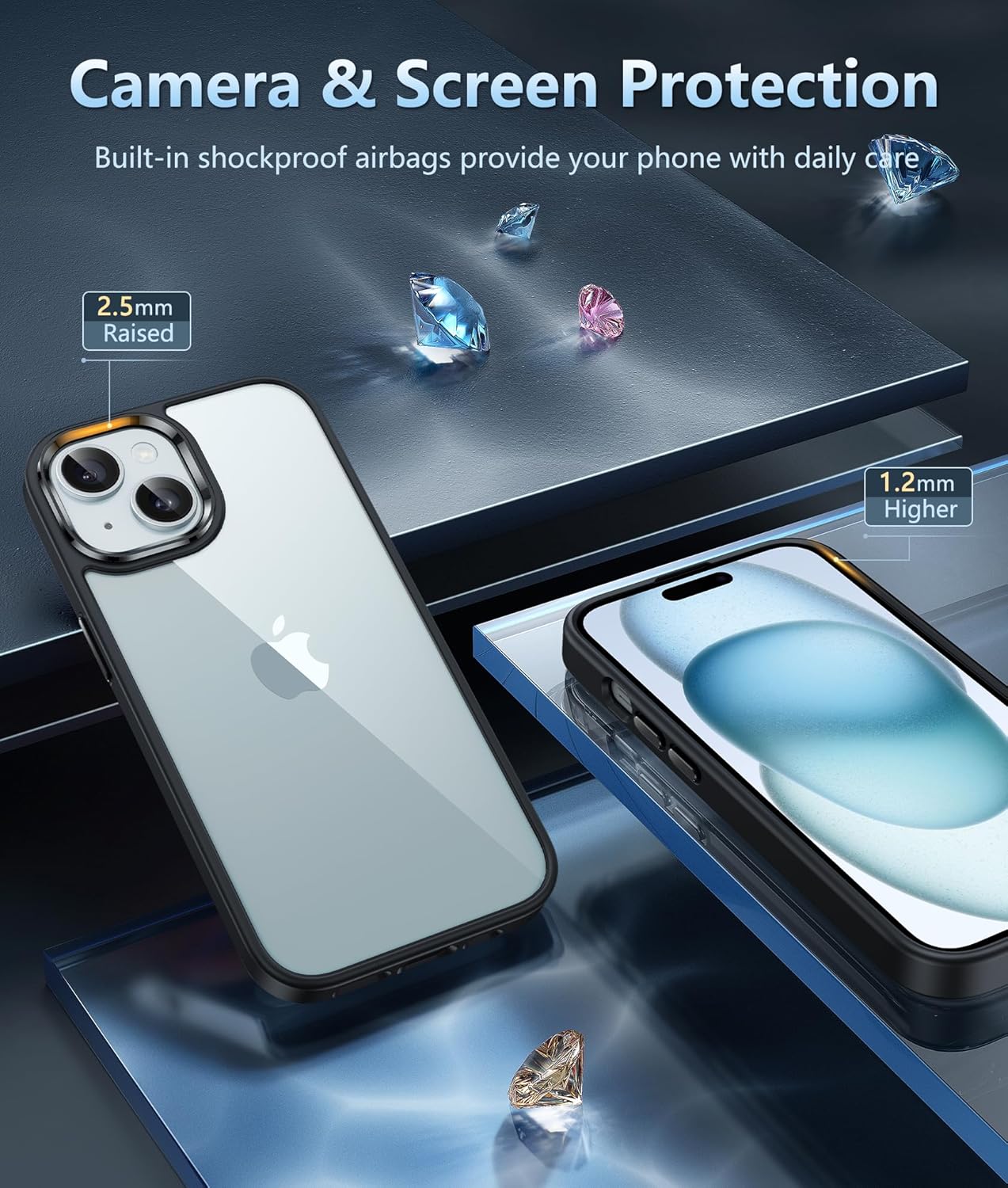 Bulge for Scratch Proof: The screen 0.05 inch (1.2 mm) raised edge and the camera lens 0.1 inch (2.5 mm) raised edge of our iPhone 15 clear case can prevent daily scratches when the phone is placed down on a table. We focus on every detail