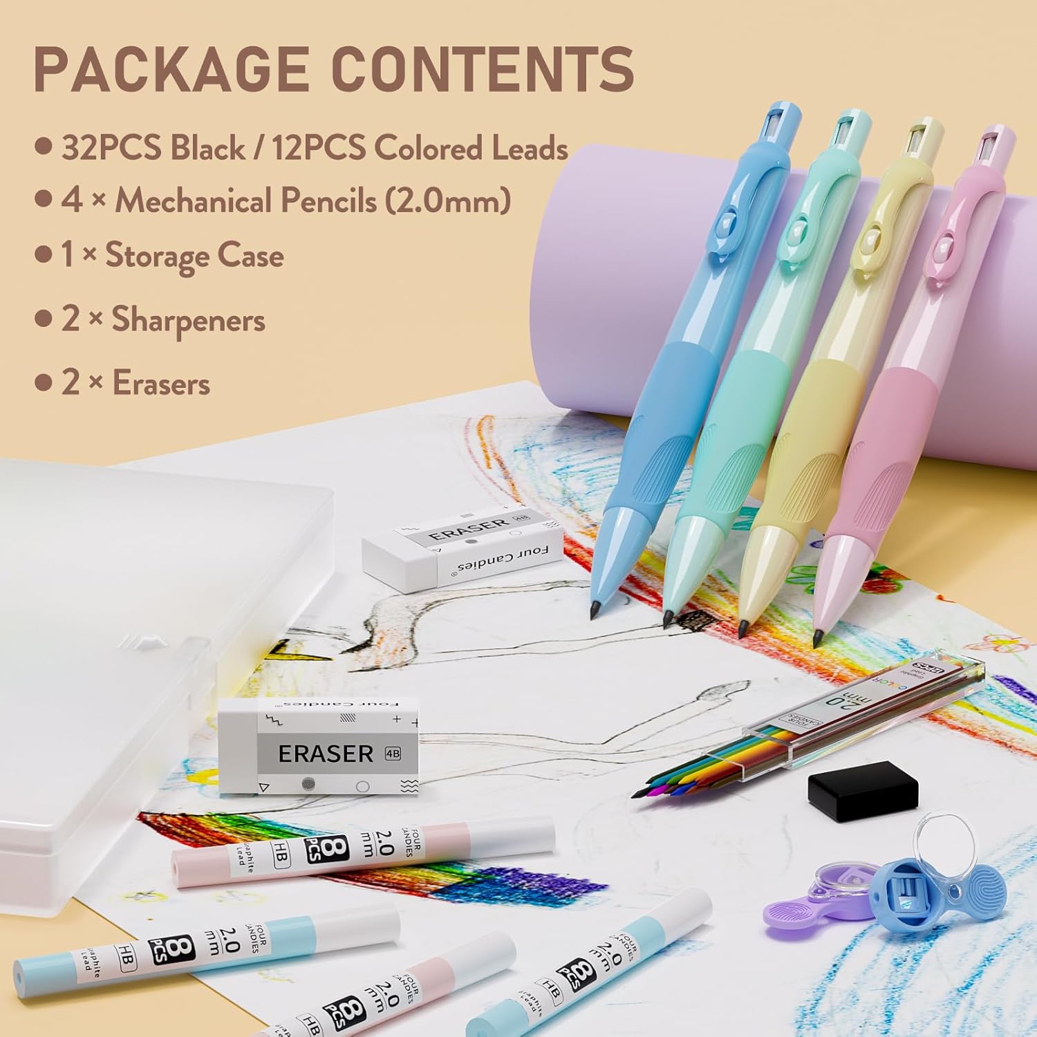 [PACKAGE CONTENT] You will get a set of aesthetic school supplies including 4pcs mechanical pencils of different colors (2.0MM), 4 tubes of 2.0MM black lead refills, a total of 32pcs (8pcs/tube, HB), 1 tube of 2.0MM colored Leads (12pcs), 2pcs magnifying glass-shaped lead sharpeners (Note: The color of the sharpener is randomly shipped), 2pcs 4B-soft erasers and 1 Storage Case.