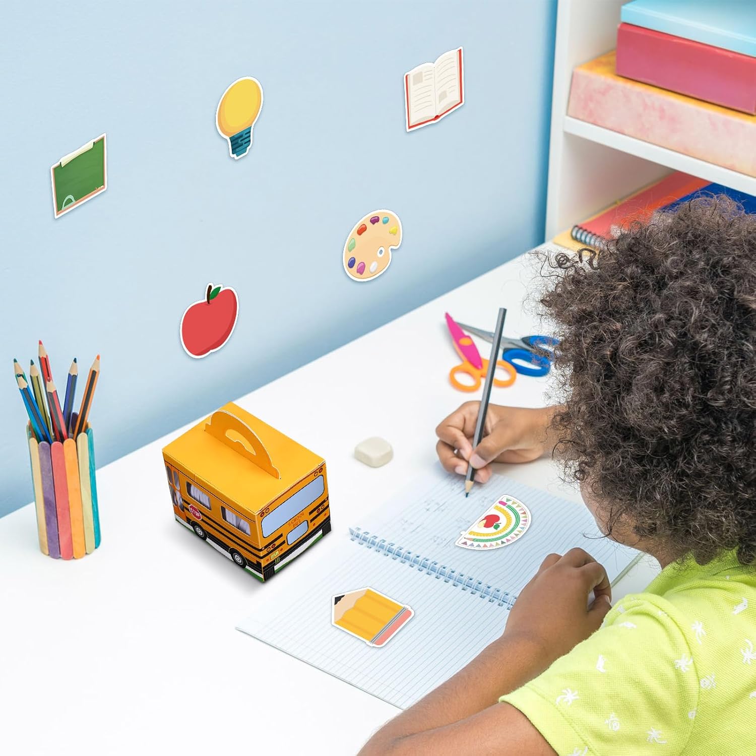 Suitable Size: each school reminders notepad is about 2.95 x 2.95 inches, which is convenient for you to carry around and record anything you want to note down, and the school bus sticky note holder box is about 4.3 x 3 x 3 inches, big enough to hold your sticky notes