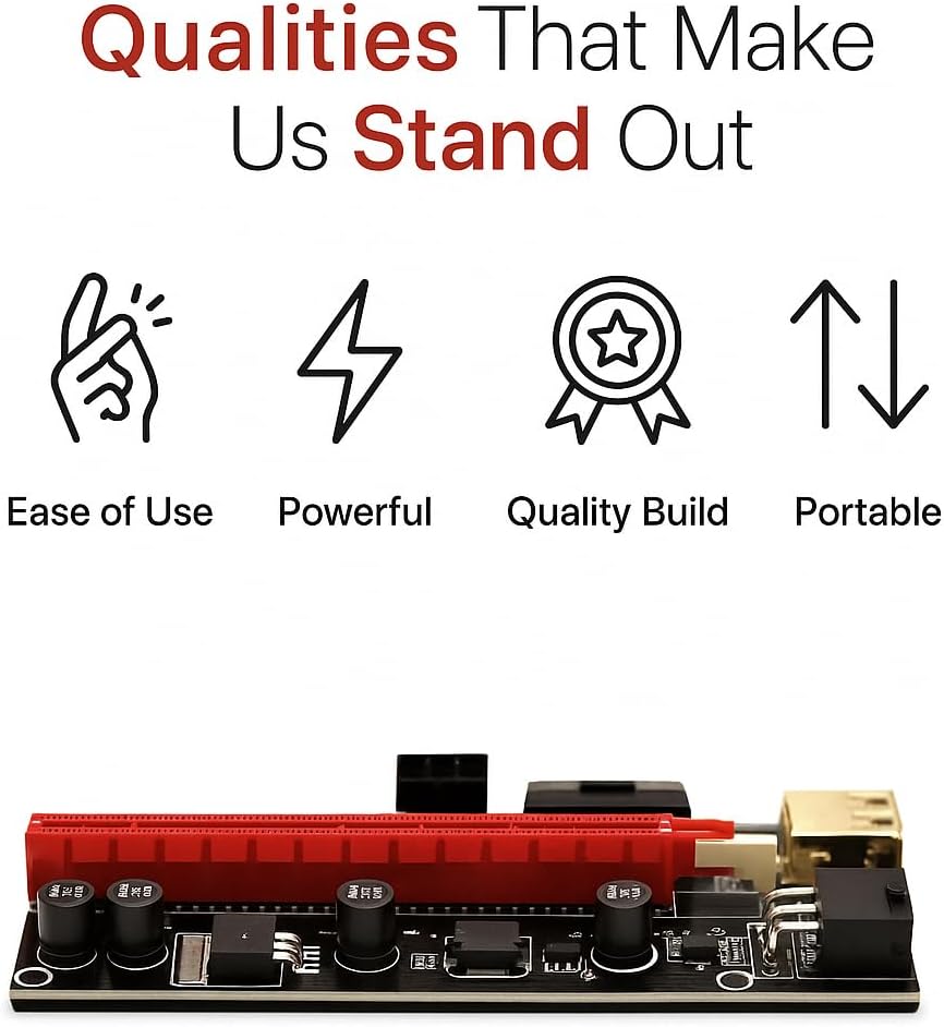 Complete Plug-and-Play Setup – No drivers or tools required. Comes with PCIe SATA expansion card, SATA cable, and riser board. Compatible with GPU support brackets, graphics card support frames, and major mining rigs.