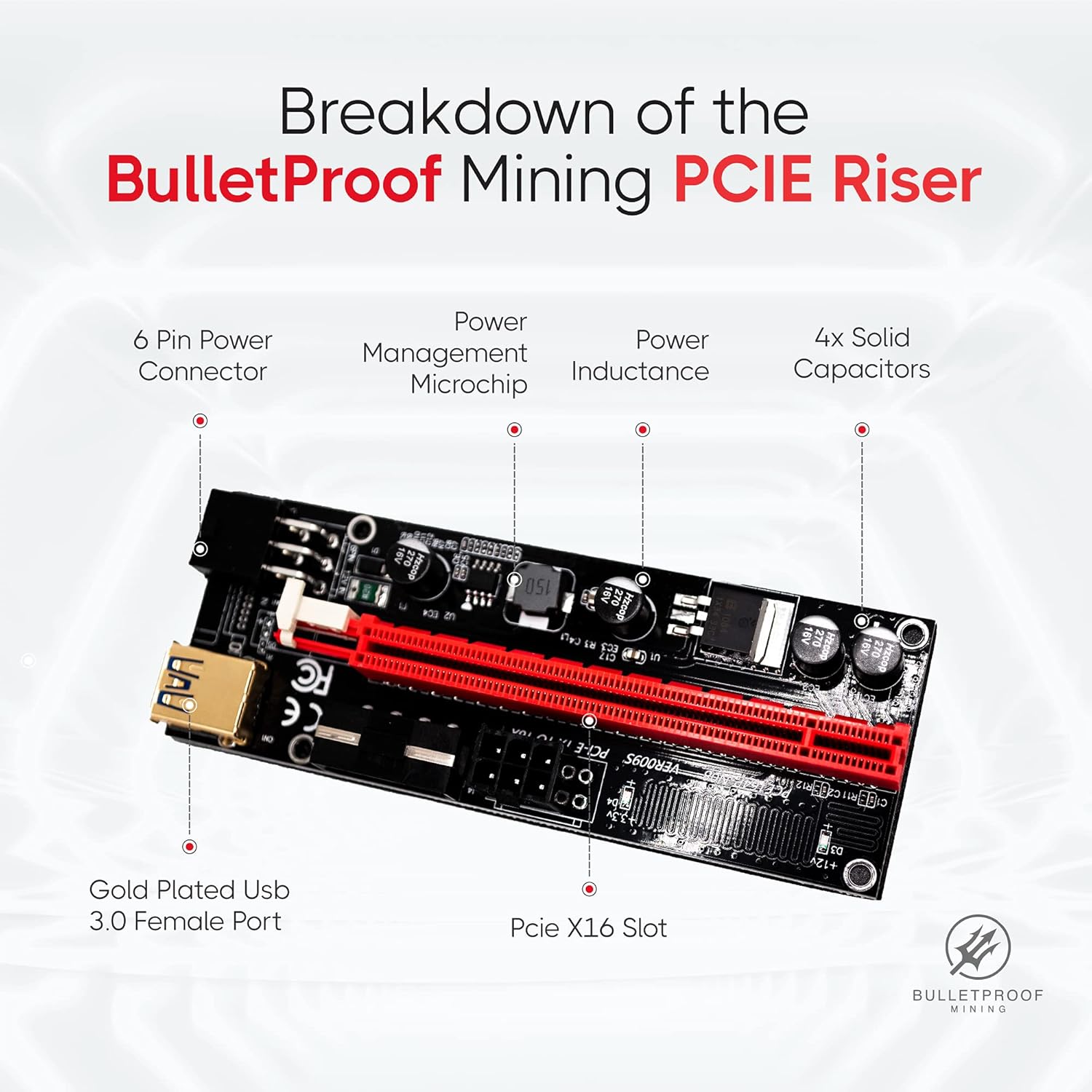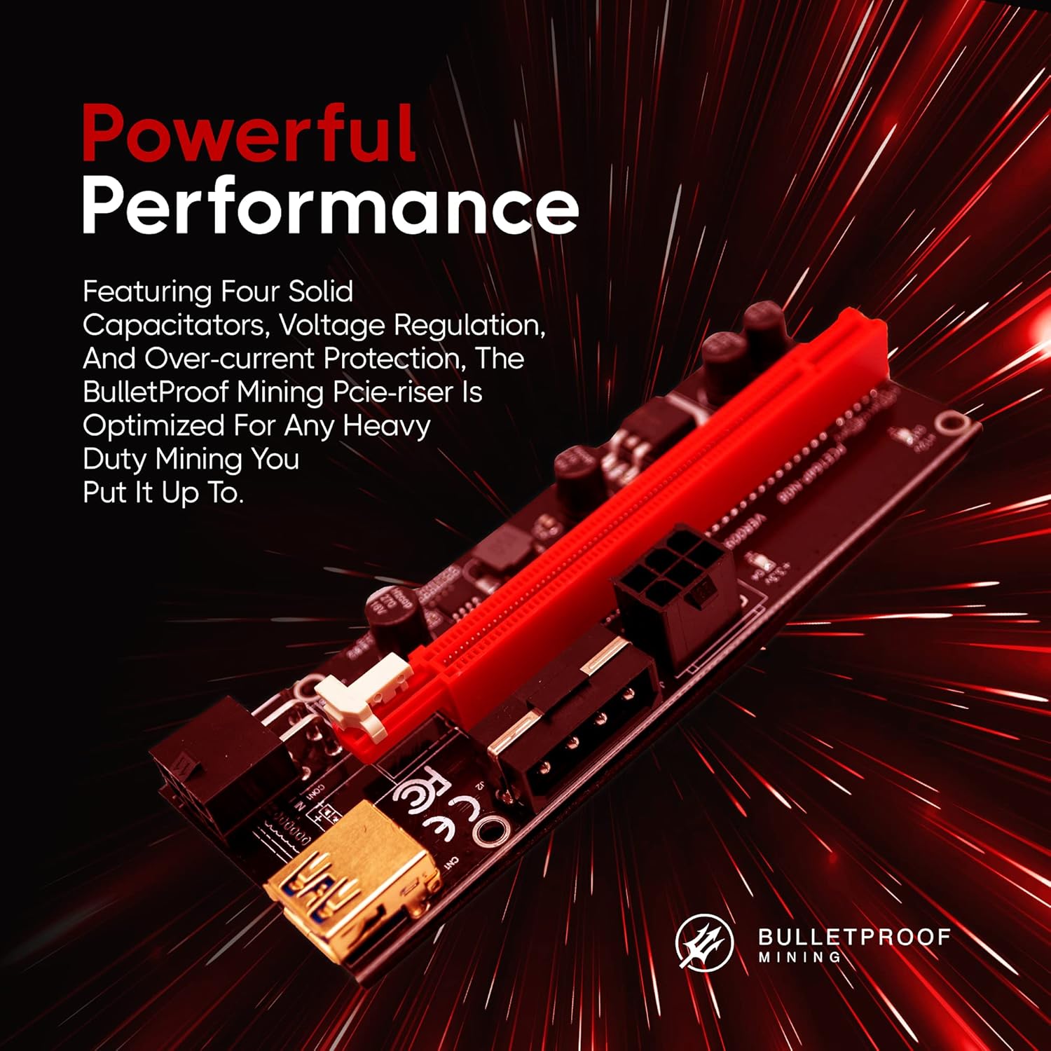 Latest VER 010S PCIe Riser Card with LED Indicator – Features an onboard LED indication board and 8 solid capacitors for superior voltage regulation and system stability. Built for high-performance GPU mining with both AMD and NVIDIA graphics cards.