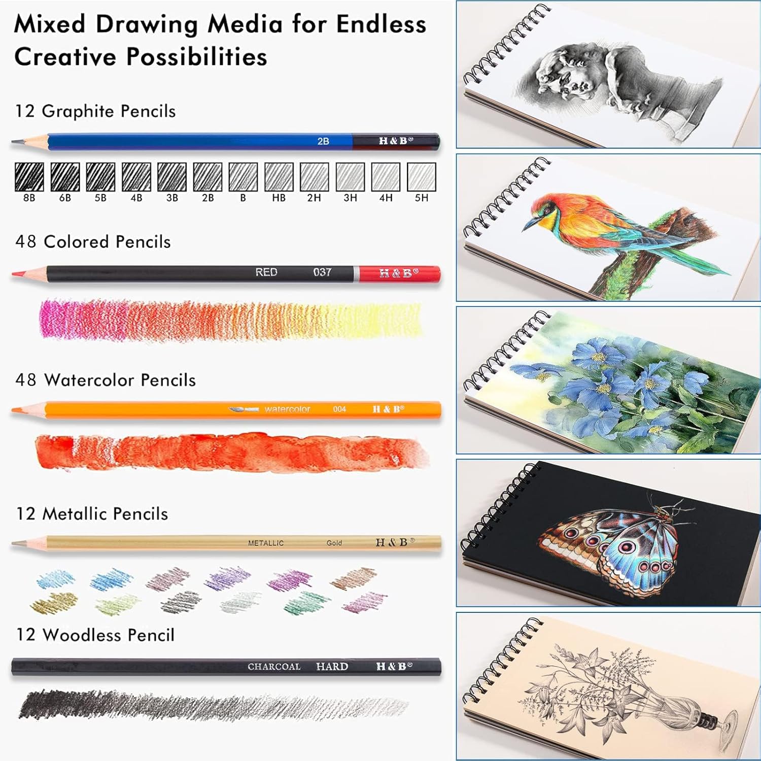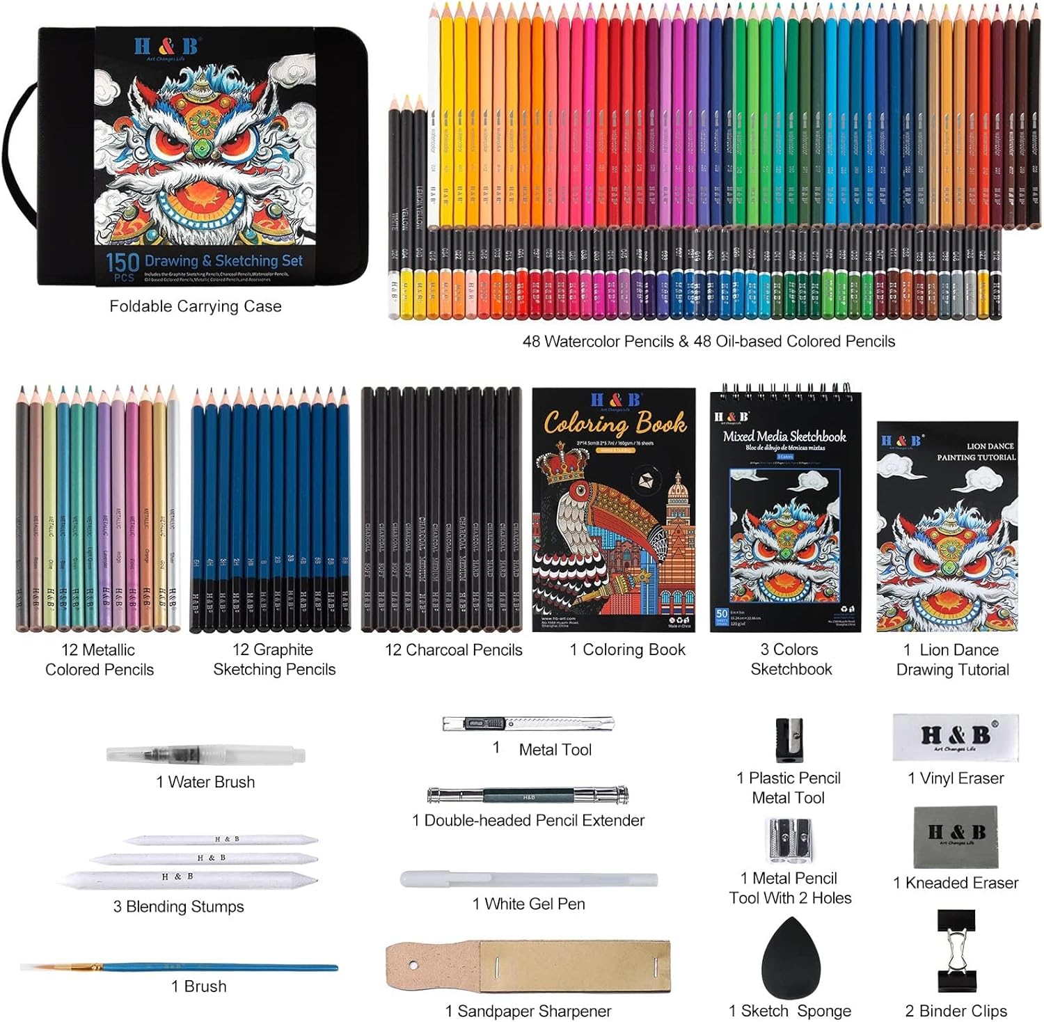 [Professional And Complete Drawing Supplies Set] – H&B 150 Pack Art Coloring pencils set Include : 48*Oil Based Colored Pencil and 48*Watercolor Pencils ,12*Graphite Sketching Pencils,12*Black Charcoal pencil,12* Metallic Colored Pencils,2* Book and other accessories..Each pencil is marked with color name and model,you can meet with what you want in sketch creation.