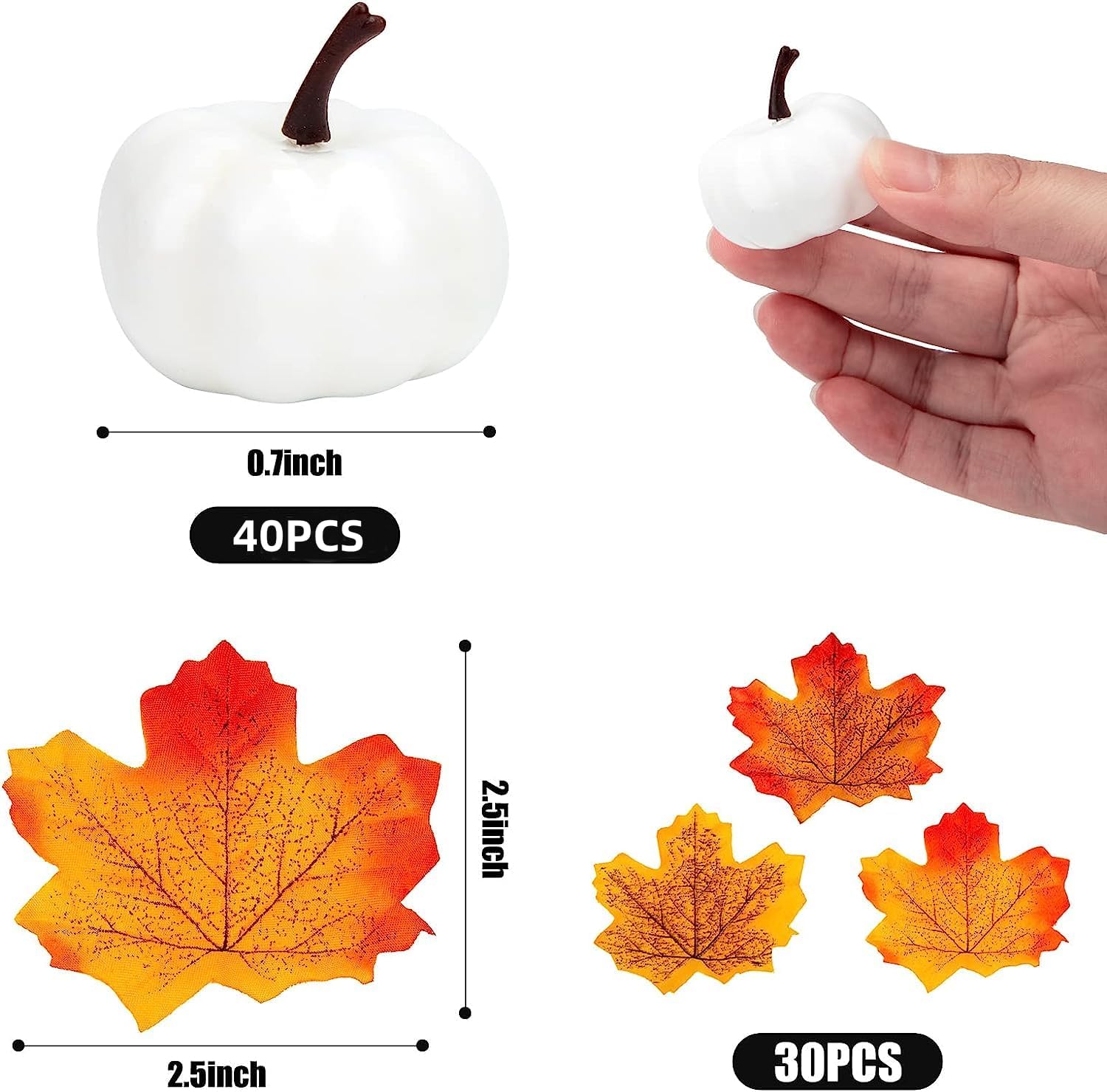 What You Will Get – The package comes with 40 PCS small size white artificial pumpkins and 30 PCS maple leaves. Each fake pumpkin measures 0.7 inches, and each maple leaf measures 2.5 inches.