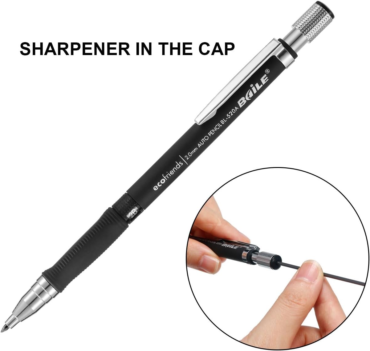 With a sharpener in the cap of mechanical pencil, you can sharpen the refills easily and conveniently at office, school or workshop.