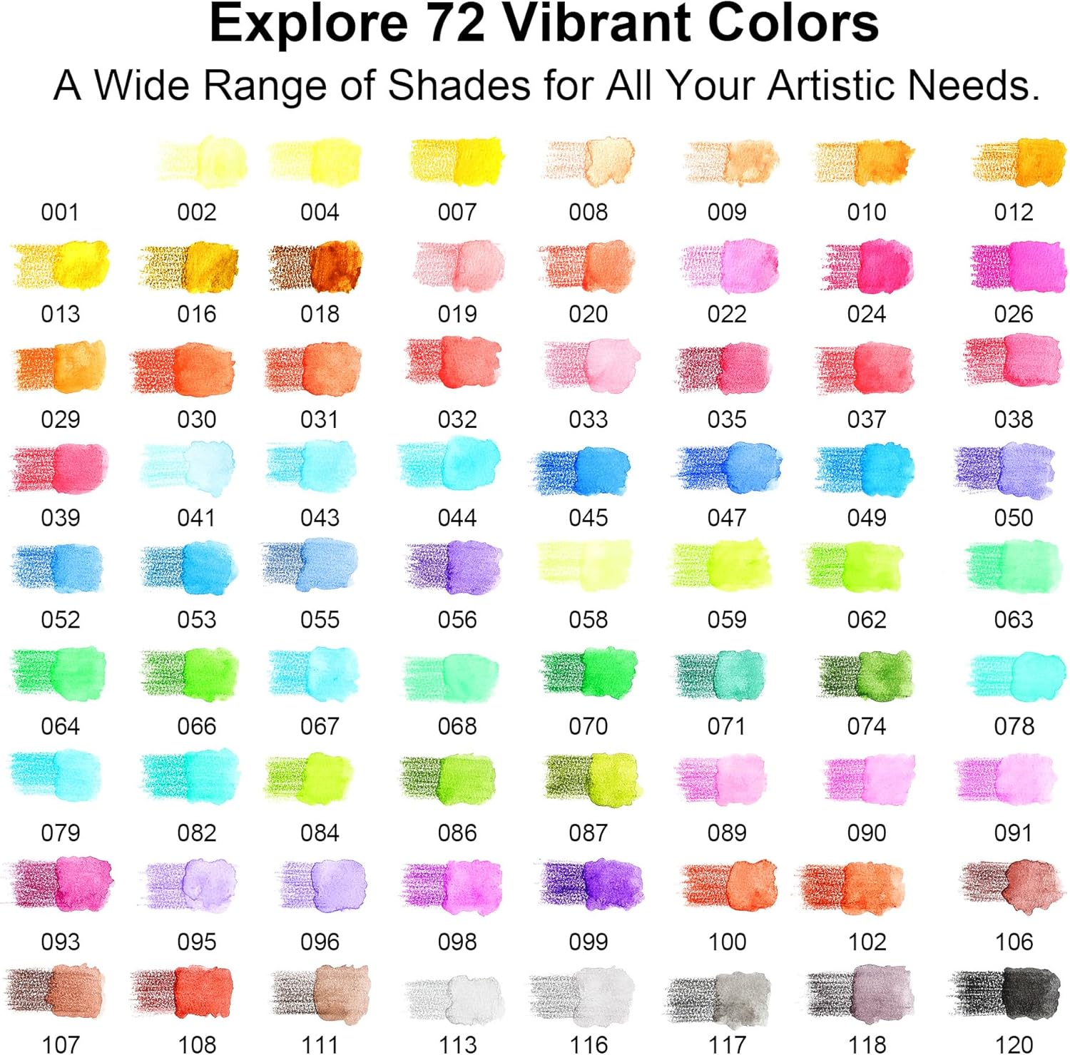 Versatile Color Range: Our 72-color water-soluble colored pencil set offers a comprehensive range of vibrant and rich hues, perfect for professional artists and hobbyists alike. Each pencil is crafted to provide smooth and precise coloring, whether used dry or with water for stunning watercolor effects.