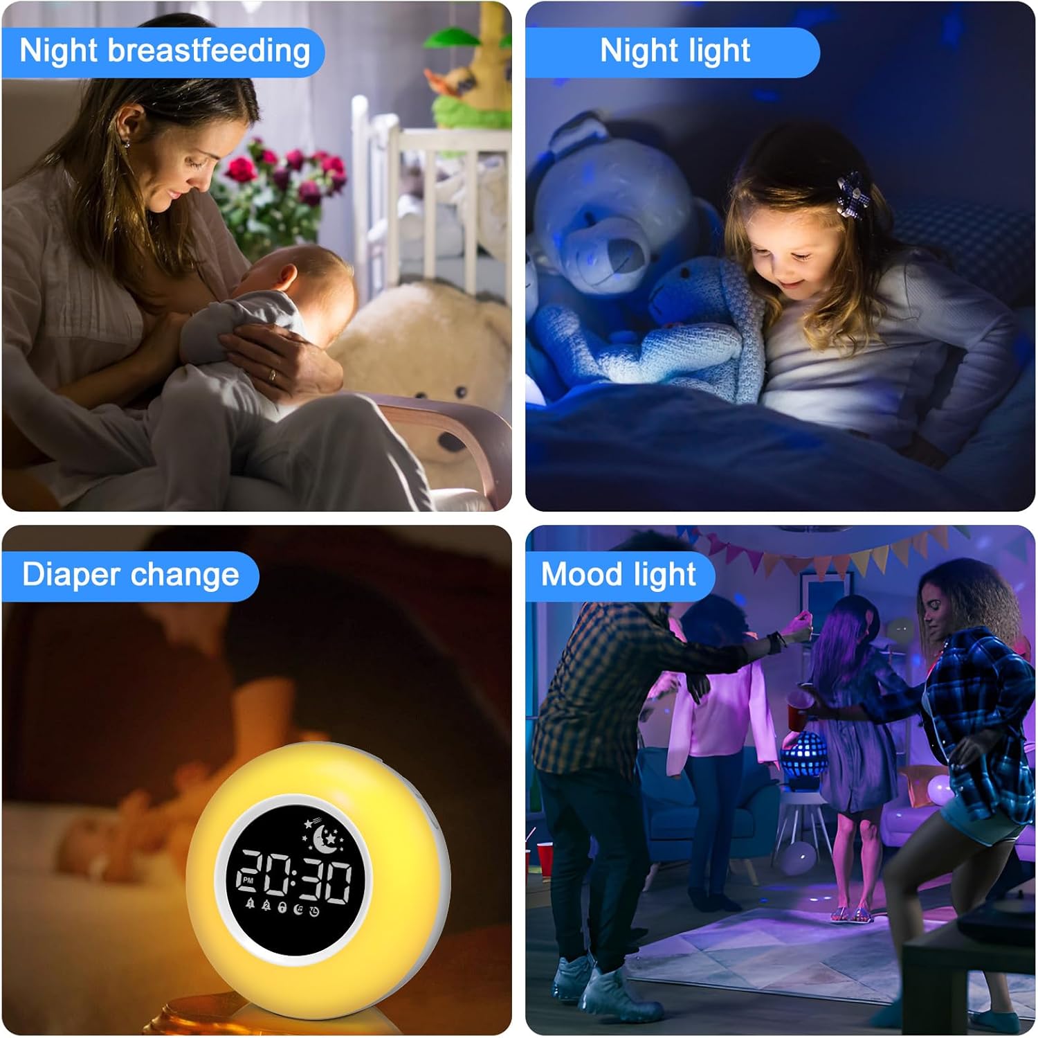 Dimmable Color-changing Night Light – For children who might be afraid of the dark, the kids wake up light alarm clock has the option of shining with 10 rich adjustable soft colors, including red light for optimum sleep. Soothing your child while bringing a vibe and atmosphere to the kid’s bedroom. The friendly nightlight also help with midnight feedings, diaper changes and reassurance following scary dreams